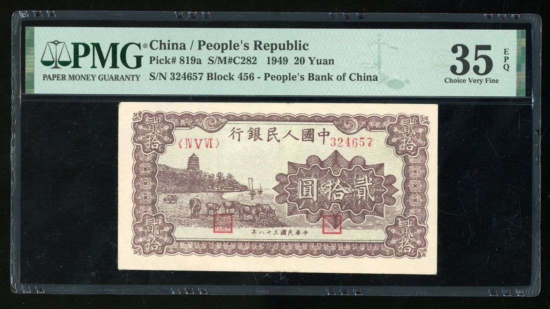 People's Bank of China, 1st Series Renminbi, 1949, 20 yuan, serial number IV V VI 324657 "Brown Liu He Pagoda",