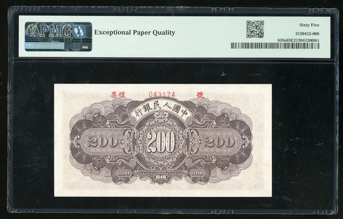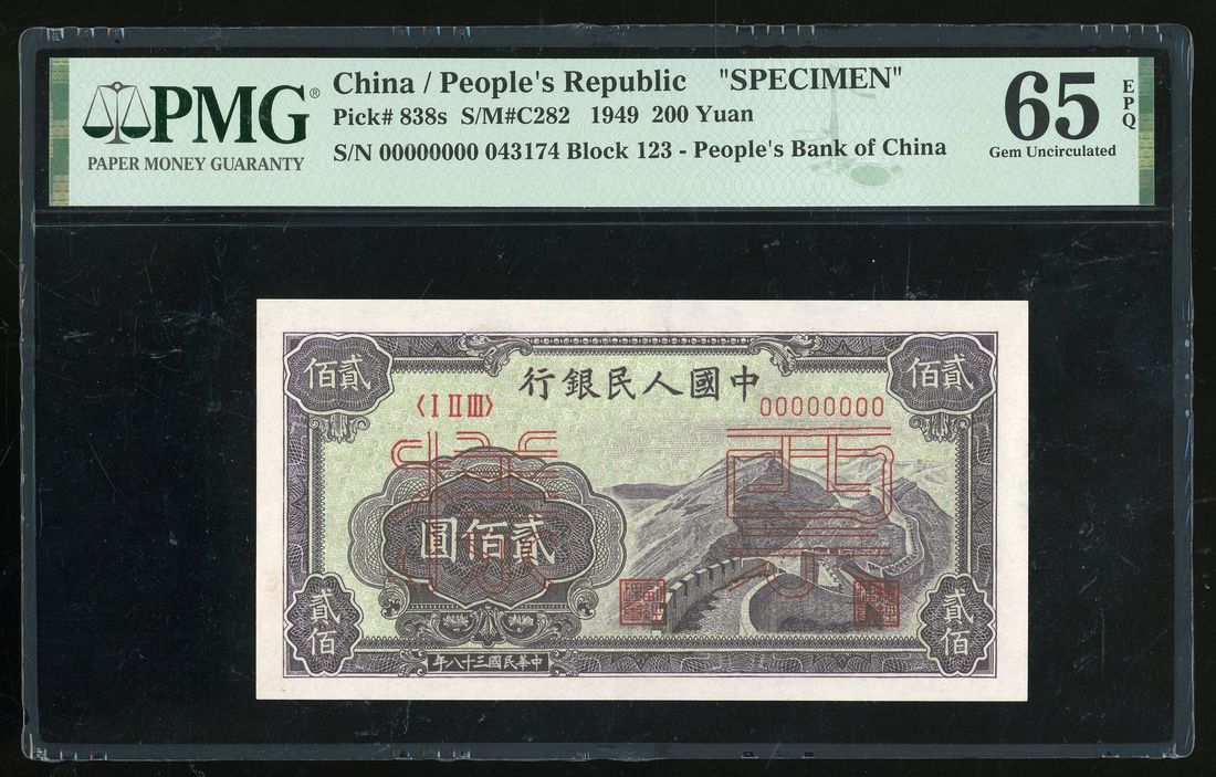 People's Bank of China, 1st Series Renminbi, 1949, specimen 200 yuan, specimen number 043174, 'Great Wall',