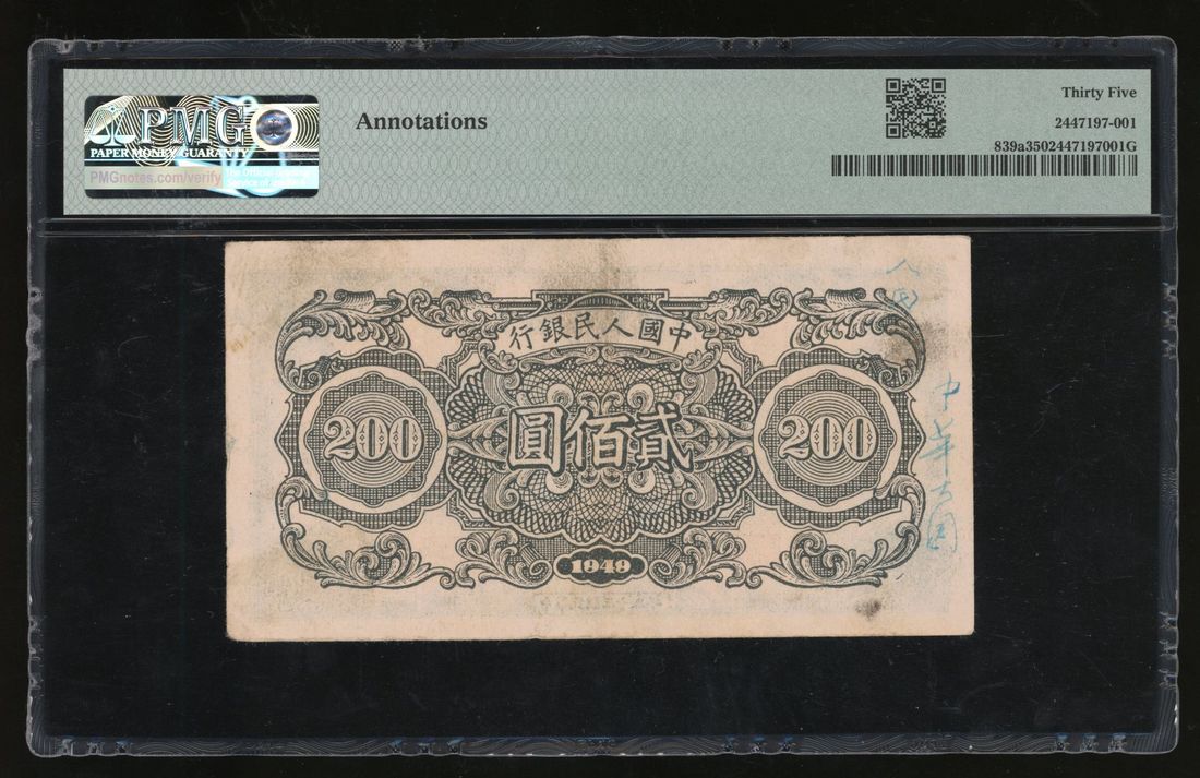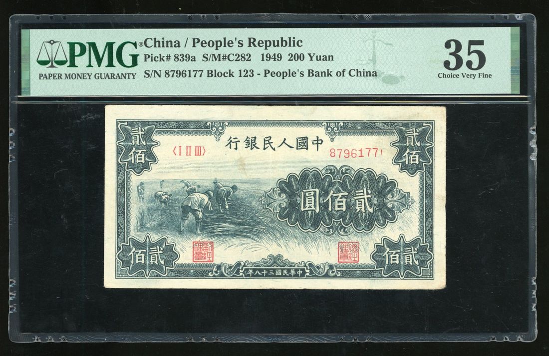 People's Bank of China, 1st Series Renminbi, 1949, 200 yuan, serial number I II III 8796177, "Harvesting",