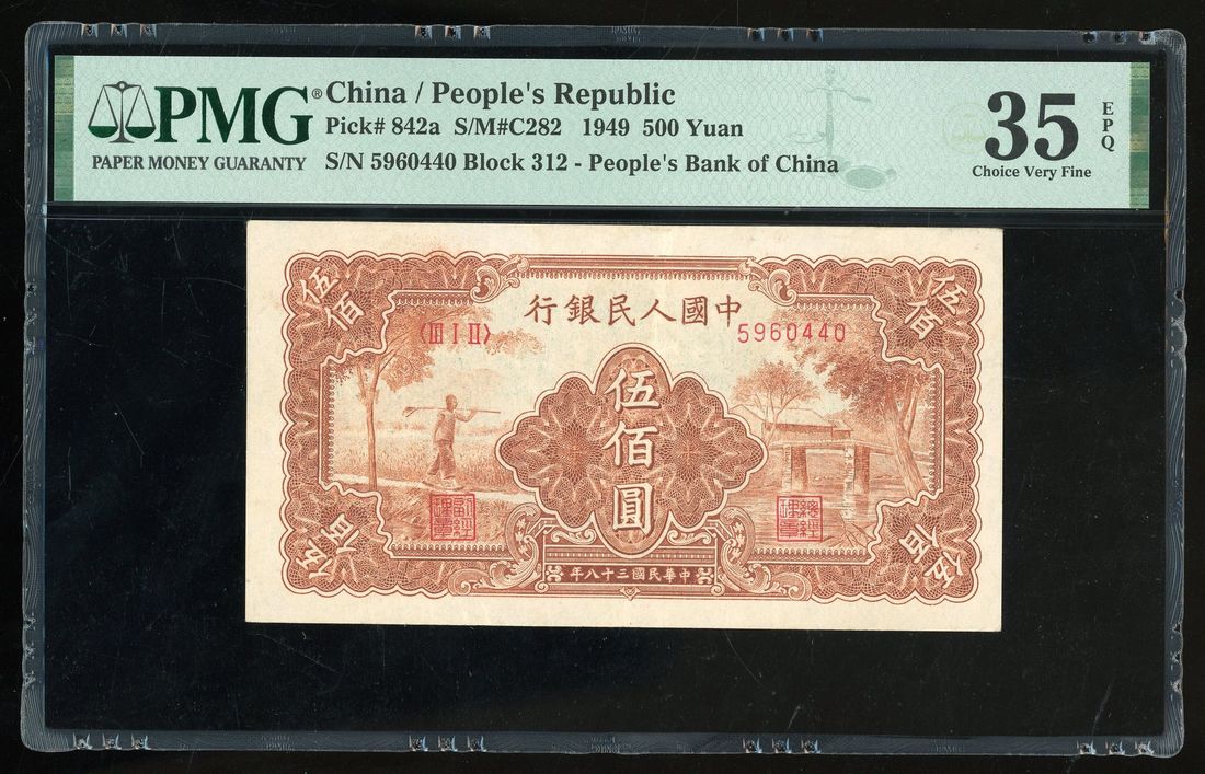 People's Bank of China, 1st Series Renminbi, 1949, 500 yuan, serial number III I II 5960440, "Farmer and Bridge",