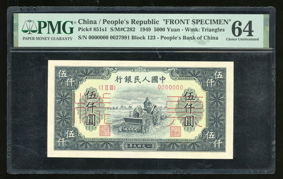 People's Bank of China, 1st Series Renminbi, 1949, obverse specimen 5000 yuan, specimen number 0027991, "Tractor",