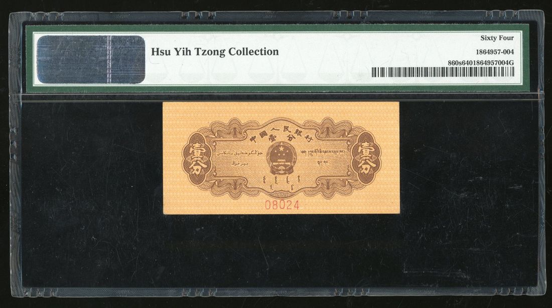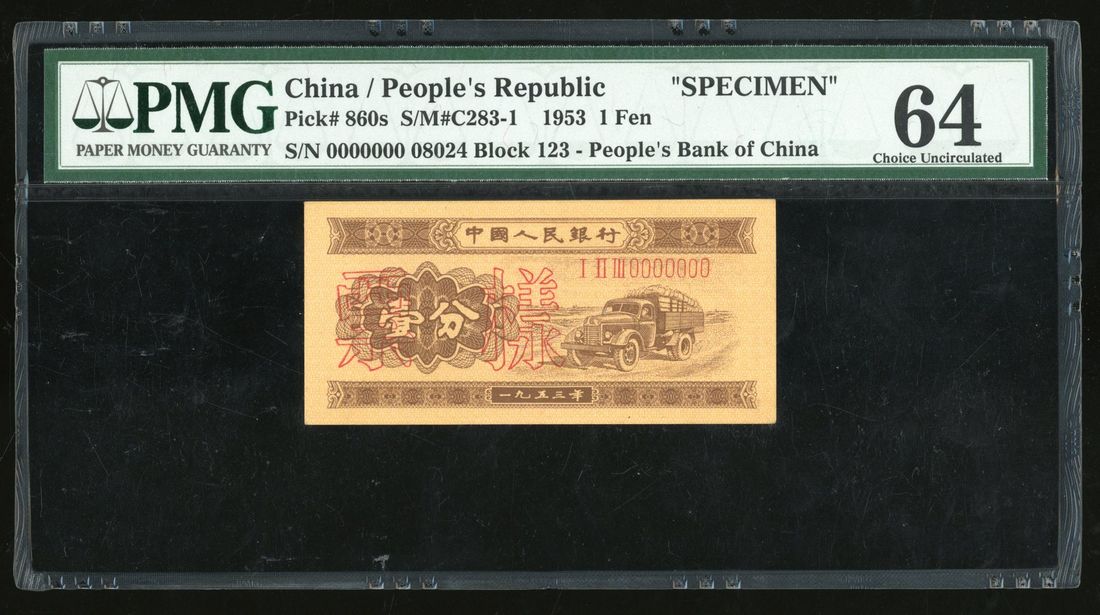 People's Bank of China, 2nd Series Renminbi, 1953, specimen 1 fen, specimen number 08024, (Pick 860s), PMG 64. First note from the full set of 2nd Series Renminbi on offer today. Ex-Hsu Yih Tzong Collection.