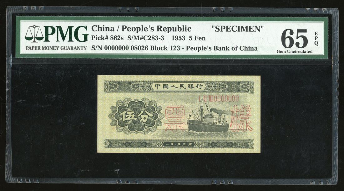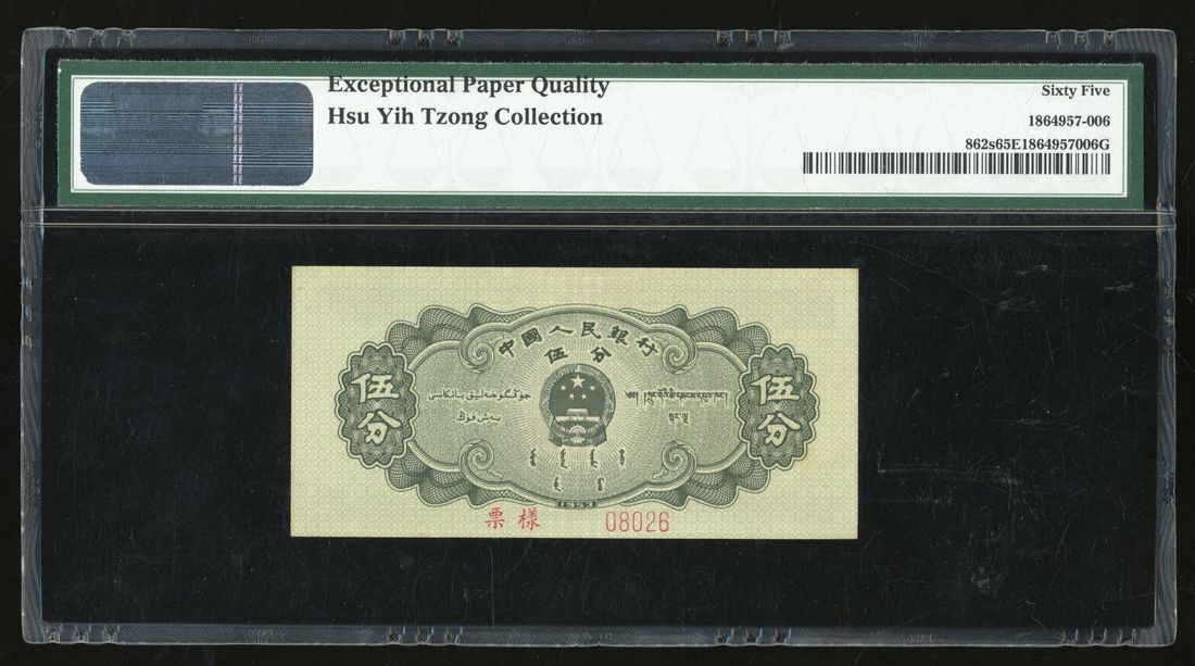 People's Bank of China, 2nd Series Renminbi, 1953, specimen 5 fen, specimen number 08026, (Pick 862s), PMG 65EPQ. Part of the full set of 2nd Series Renminbi on offer today. Ex-Hsu Yih Tzong Collection