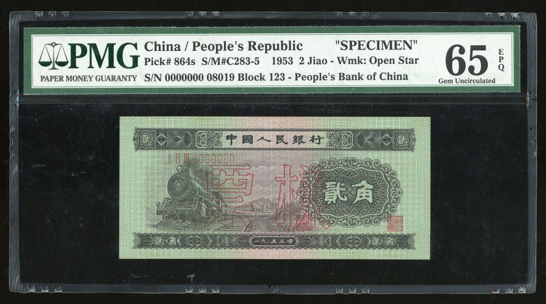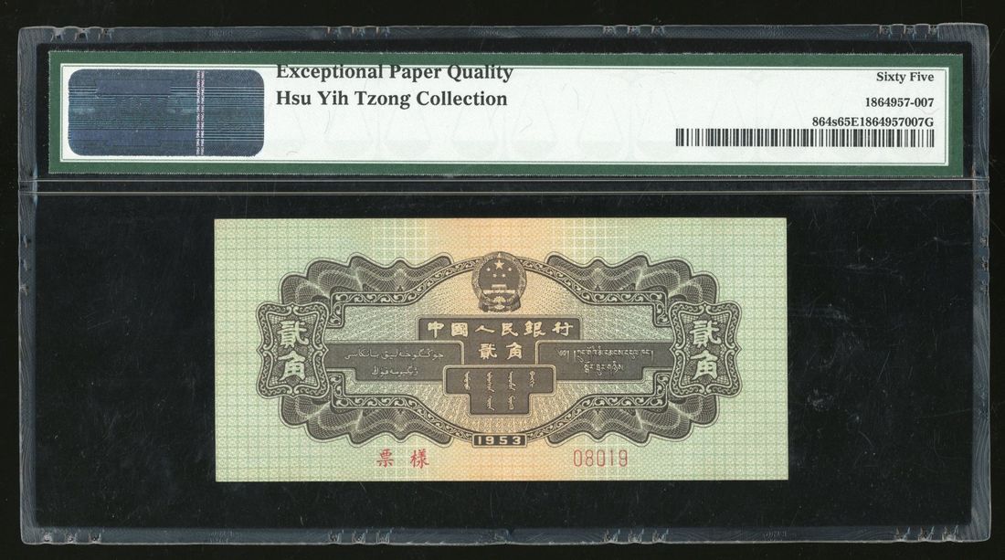 People's Bank of China, 2nd Series Renminbi, 1953, specimen 2 jiao, specimen number 08019, (Pick 864s), PMG 65EPQ. Part of the full set of 2nd Series Renminbi on offer today. Ex-Hsu Yih Tzong Collection