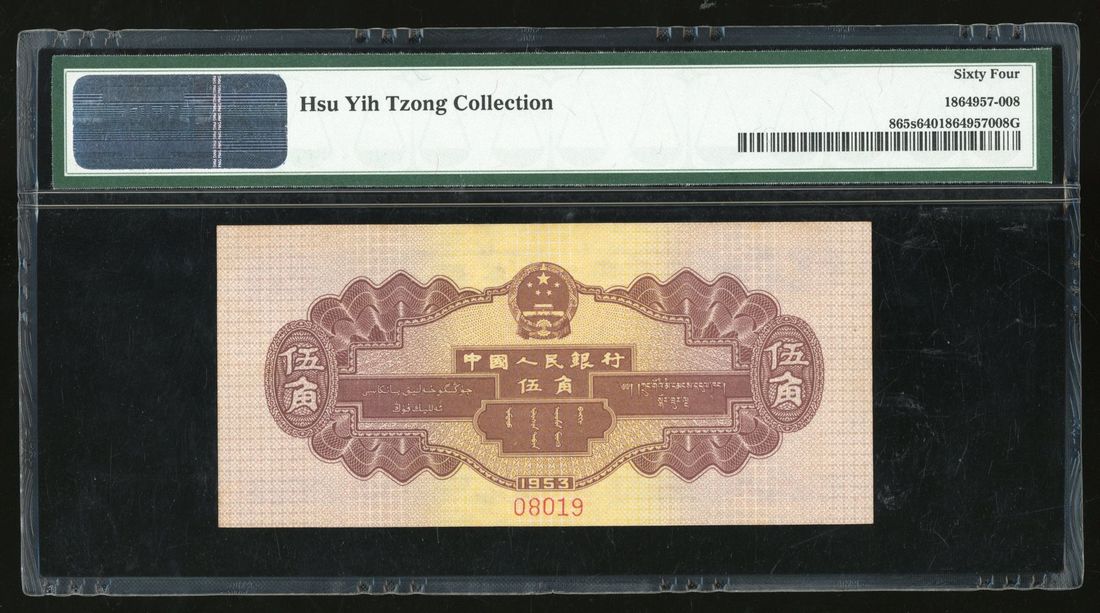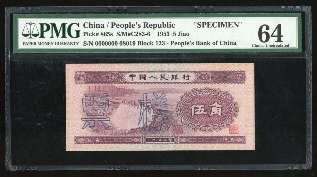 People's Bank of China, 2nd Series Renminbi, 1953, specimen 5 jiao, specimen number 08019, (Pick 865s), PMG 64. Part of the full set of 2nd Series Renminbi on offer today. Ex-Hsu Yih Tzong Collection