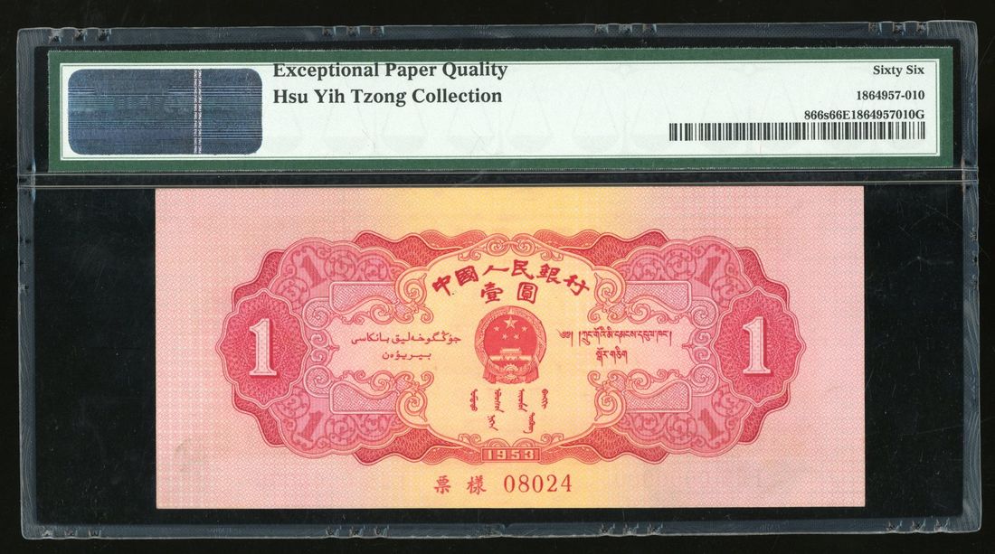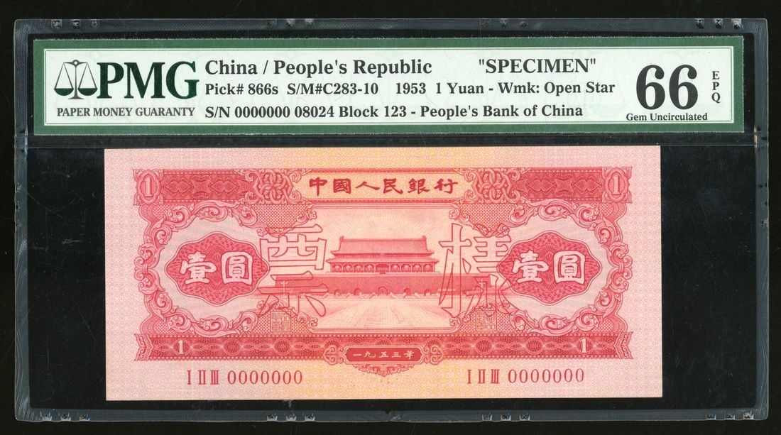 People's Bank of China, 2nd Series Renminbi, 1953, specimen 1 yuan, specimen number 08024, (Pick 866s), PMG 66EPQ. Part of the full set of 2nd Series Renminbi on offer today. Ex-Hsu Yih Tzong Collection