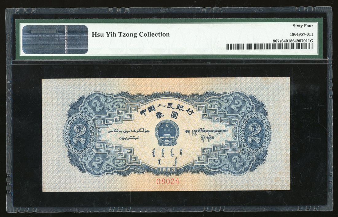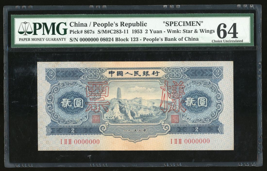 People's Bank of China, 2nd Series Renminbi, 1953, specimen 2 yuan, specimen number 08024, (Pick 867s), PMG 64. Part of the full set of 2nd Series Renminbi on offer today. Ex-Hsu Yih Tzong Collection