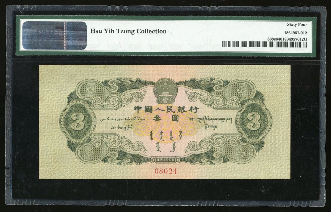 People's Bank of China, 2nd Series Renminbi, 1953, specimen 3 yuan, specimen number 08024, (Pick 868s), PMG 64. Part of the full set of 2nd Series Renminbi on offer today. Key RMB type. Ex-Hsu Yih Tzong Collection