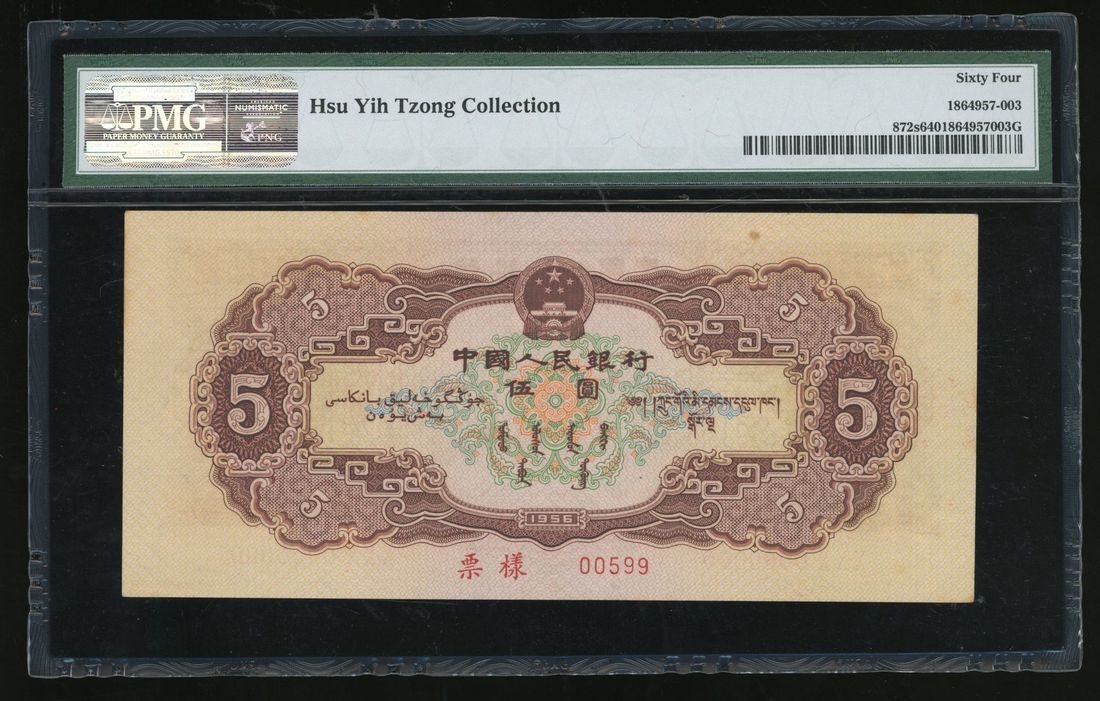 People's Bank of China, 2nd Series Renminbi, 1956, specimen 5 yuan, specimen number 00599, (Pick 872s), PMG 64. Part of the full set of 2nd Series Renminbi on offer today. A less often seen type in above average grade. Ex-Hsu Yih Tzong Collection