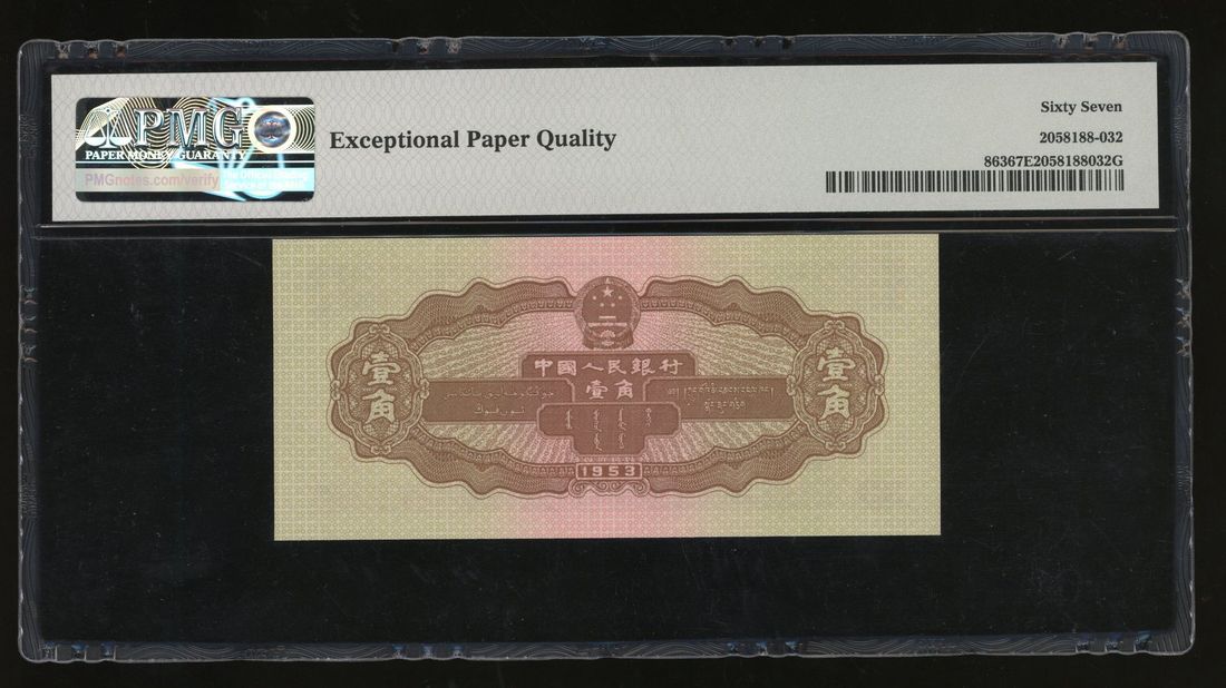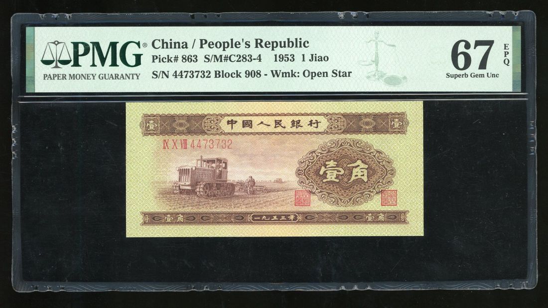 People's Bank of China, 2nd Series Renminbi, 1953, 1 jiao, serial number IX X VIII 4473732, (Pick 863), PMG 67EPQ