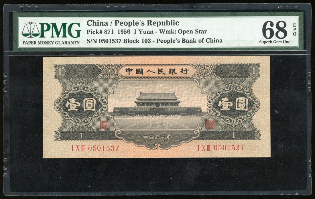People's Bank of China, 2nd Series Renminbi, 1956, 1 yuan, serial number I X III 0501537, open star watermark,