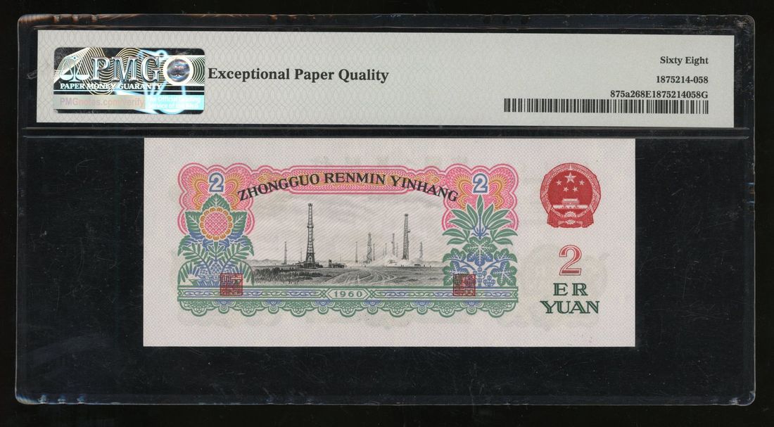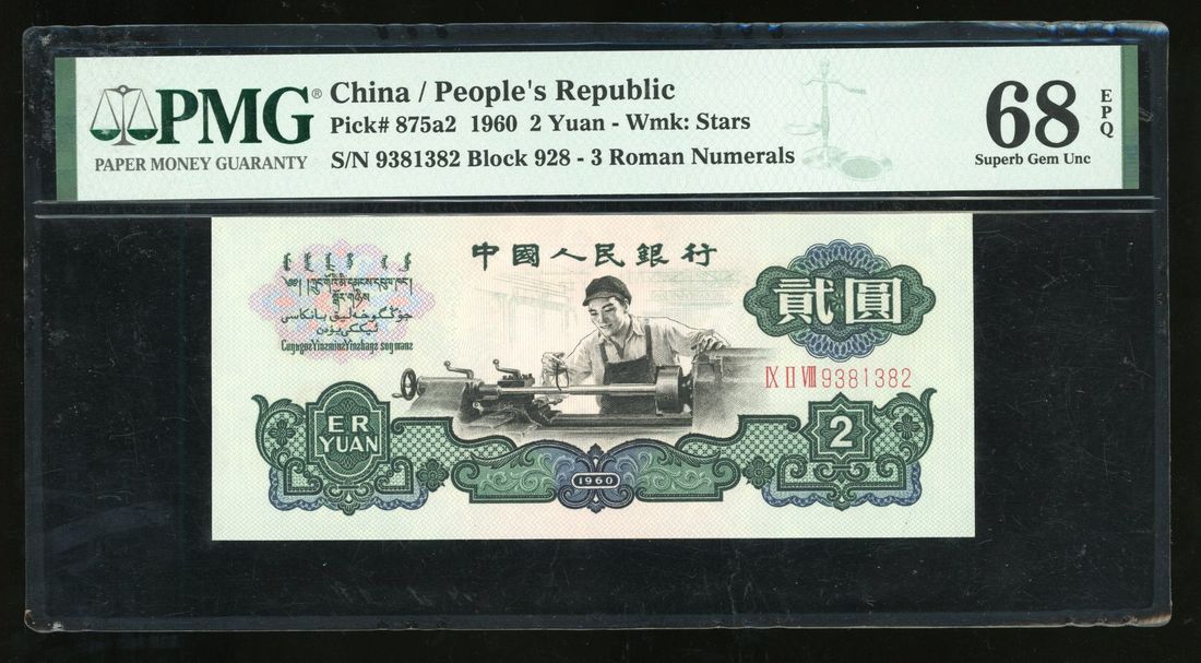 People's Bank of China, 3rd Series Renminbi, 1960, 2 yuan, serial number IX II VIII 9381382, stars watermark,