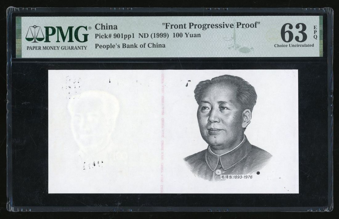 People's Bank of China, 5th Series Renminbi, uniface front progressive proof of 100 yuan, ND(1999), black and white, Mao portrait at right, with watermark at left, though without ink but engraving of emblem, bank name and denomination etc can still be seen clearly,