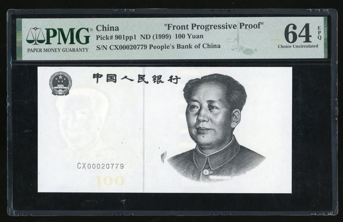 People's Bank of China, 5th Series Renminbi, uniface front progressive proof of 100 yuan, ND(1999), serial number CX00020779, with emblem at top left, UV security feature '100' below serial number, Mao watermark at left,