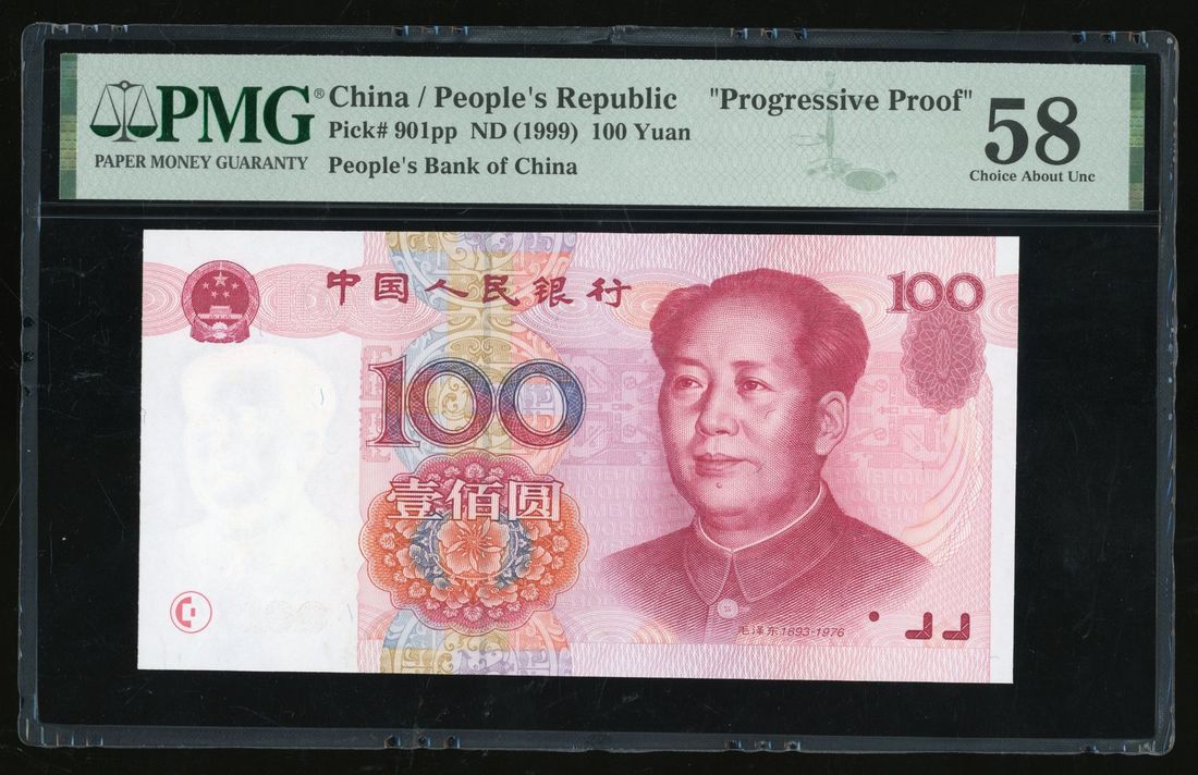 People's Bank of China, 5th Series Renminbi, 1999, obverse progressive proof 100 yuan, obverse largely complete (only missing the serial numbers) and the '100' denomination at lower left is not in green but engraving present, watermark of Mao Zedong present, the reverse with underprints only, notably missing building and columns,