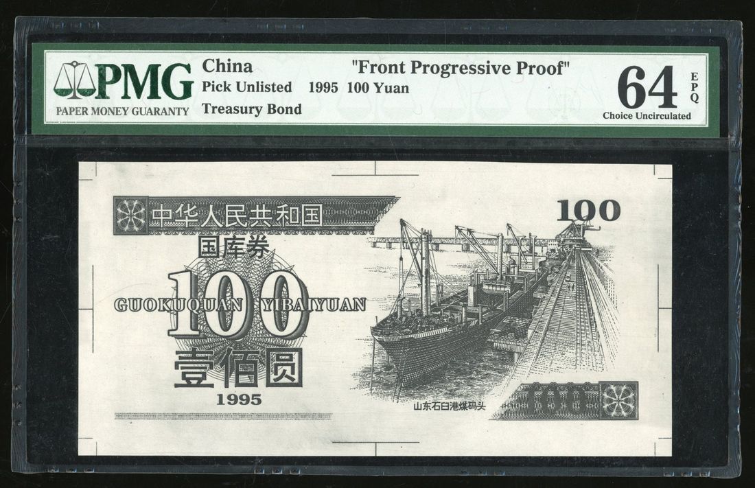 People's Bank of China, progressive proof 100 yuan Treasury Bond, 1995, uniface, black and white, docked cargo ship at right,