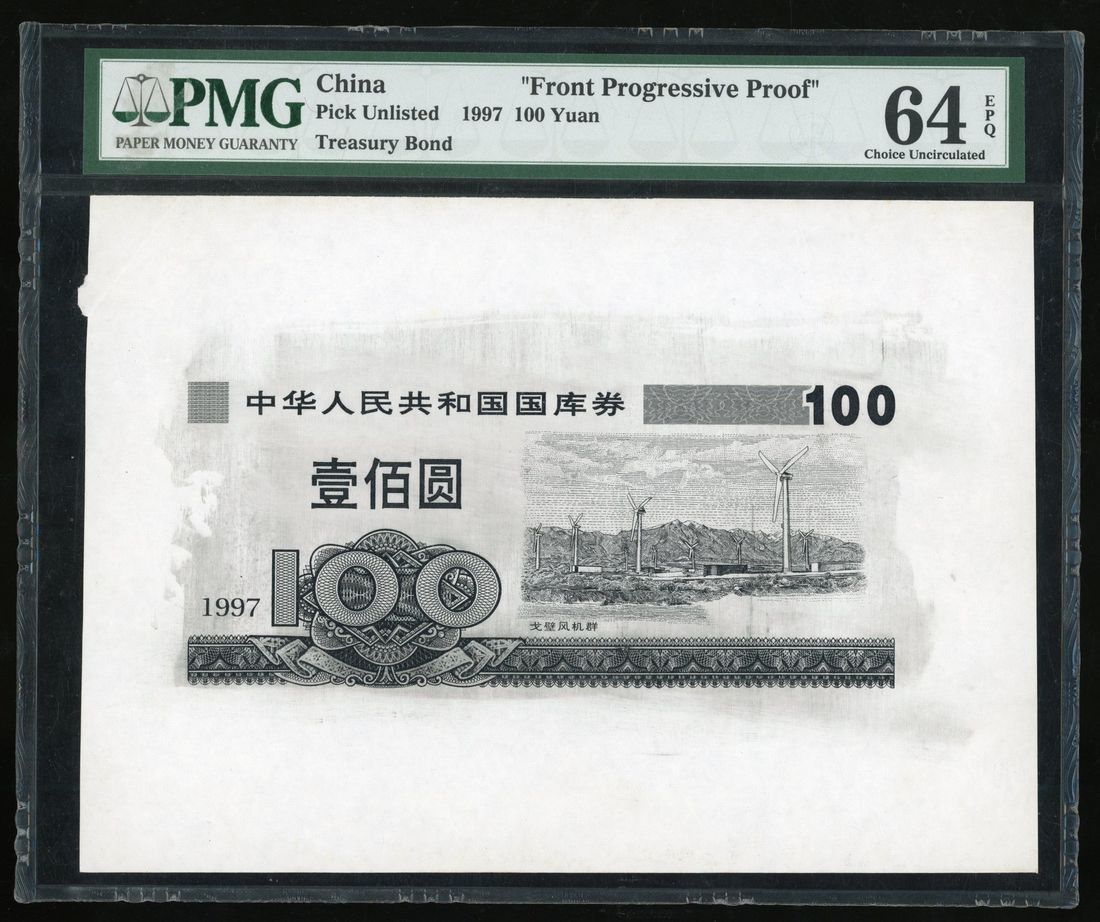 People's Bank of China, progressive proof 100 yuan Treasury Bond, 1997, uniface, black and white, wind turbine at Gobi desert at right,