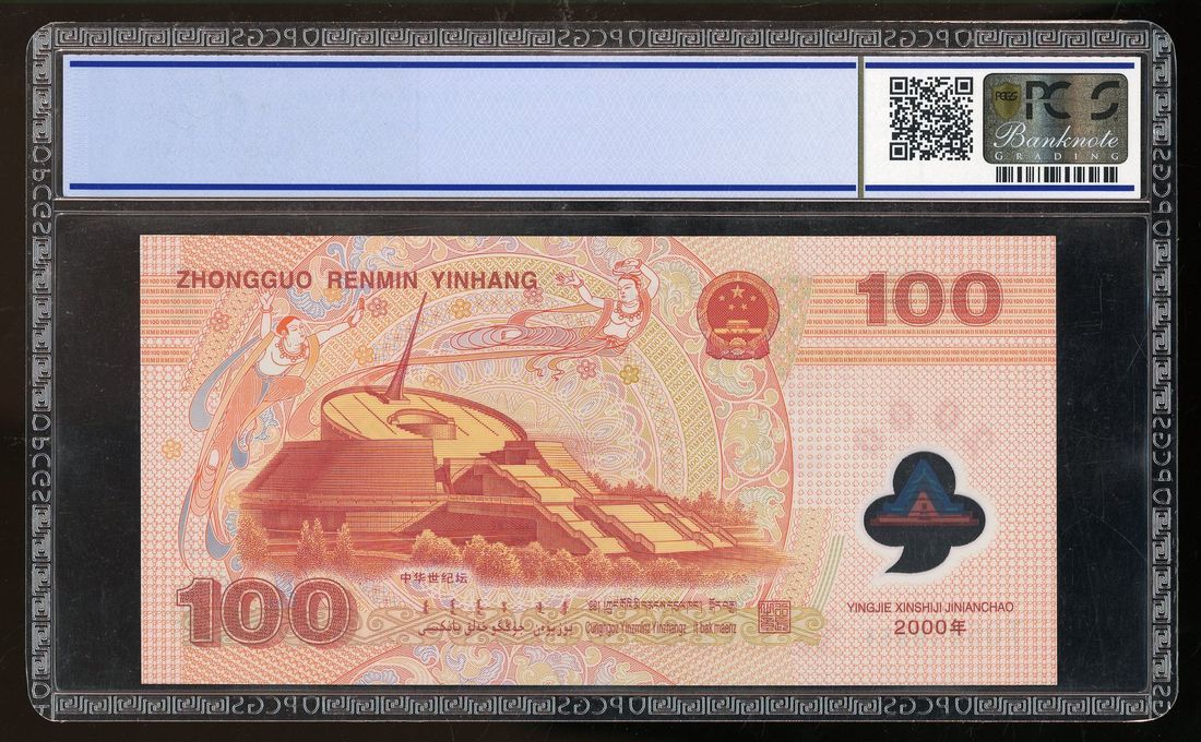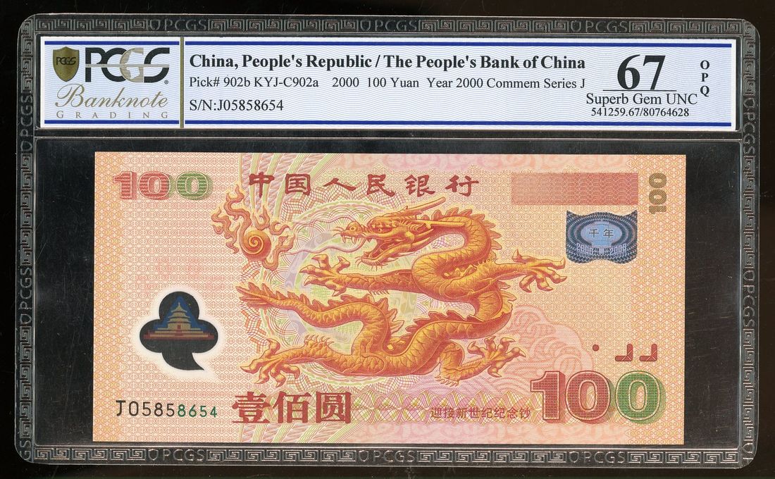People's Bank of China, 100 yuan, 2000, New Millennium commemorative issue, serial number J 05858654, (Pick 902b), PCGS 67OPQ