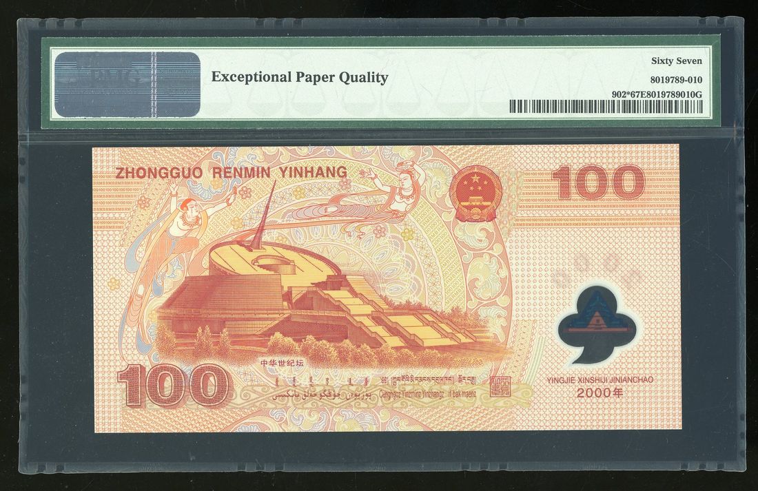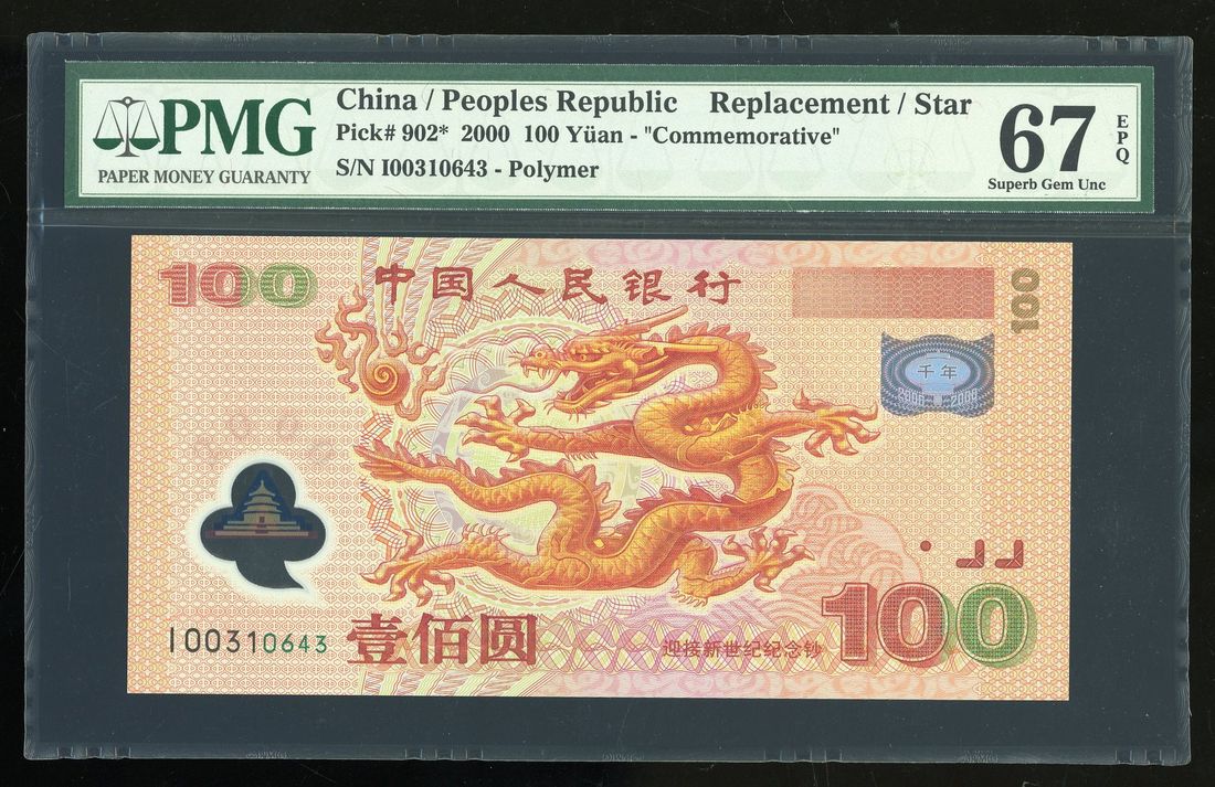 People’s Bank of China, replacement 100 yuan, 2000, New Millenium commemorative issue, polymer, serial number I 00310643,