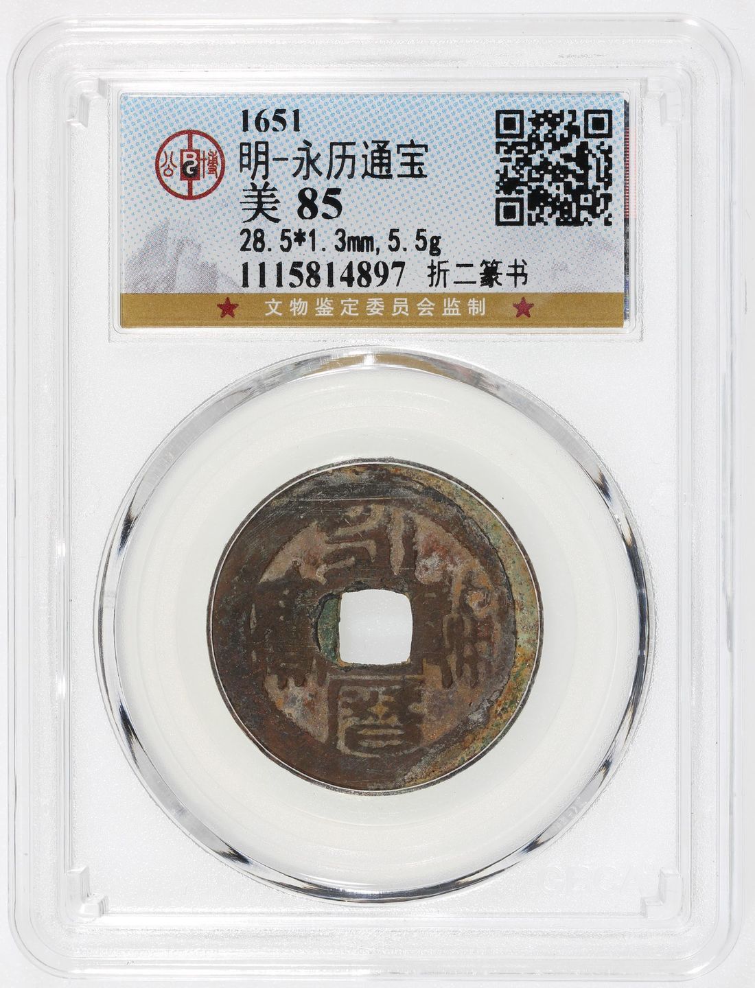 China, Ming / Qing Dynasty, [GBCA 85] brass 2 cash, 'Yong Li Tong Bao' in seal script, 1647-1662, originally issued by Southern Ming's Prince of Gui, the seal script 2 cash type was minted in Nagasaki and issued by Zheng Chenggong for circulation along the southeastern coast of China, 28.5x1.3mm, weighs 5.5g