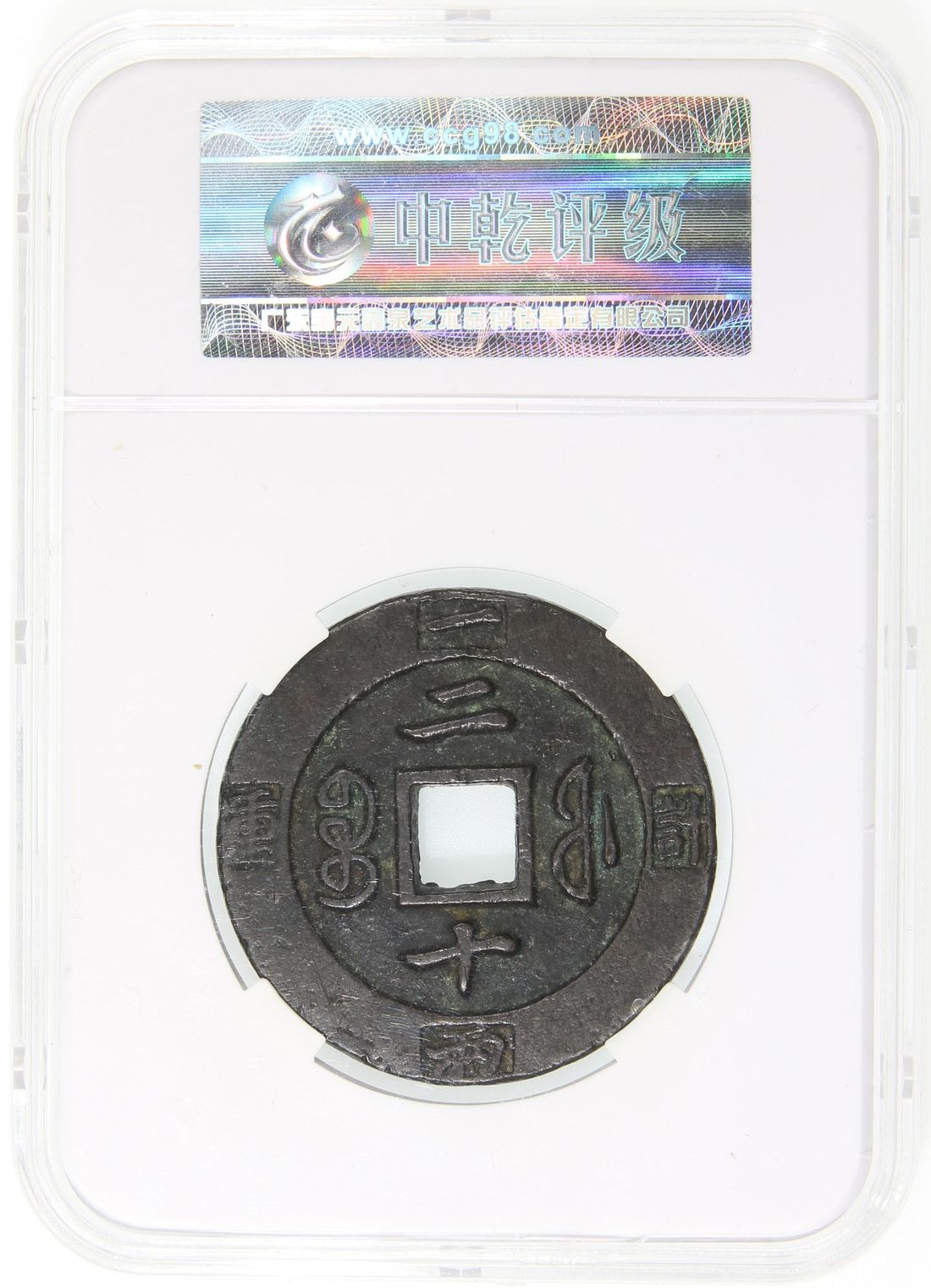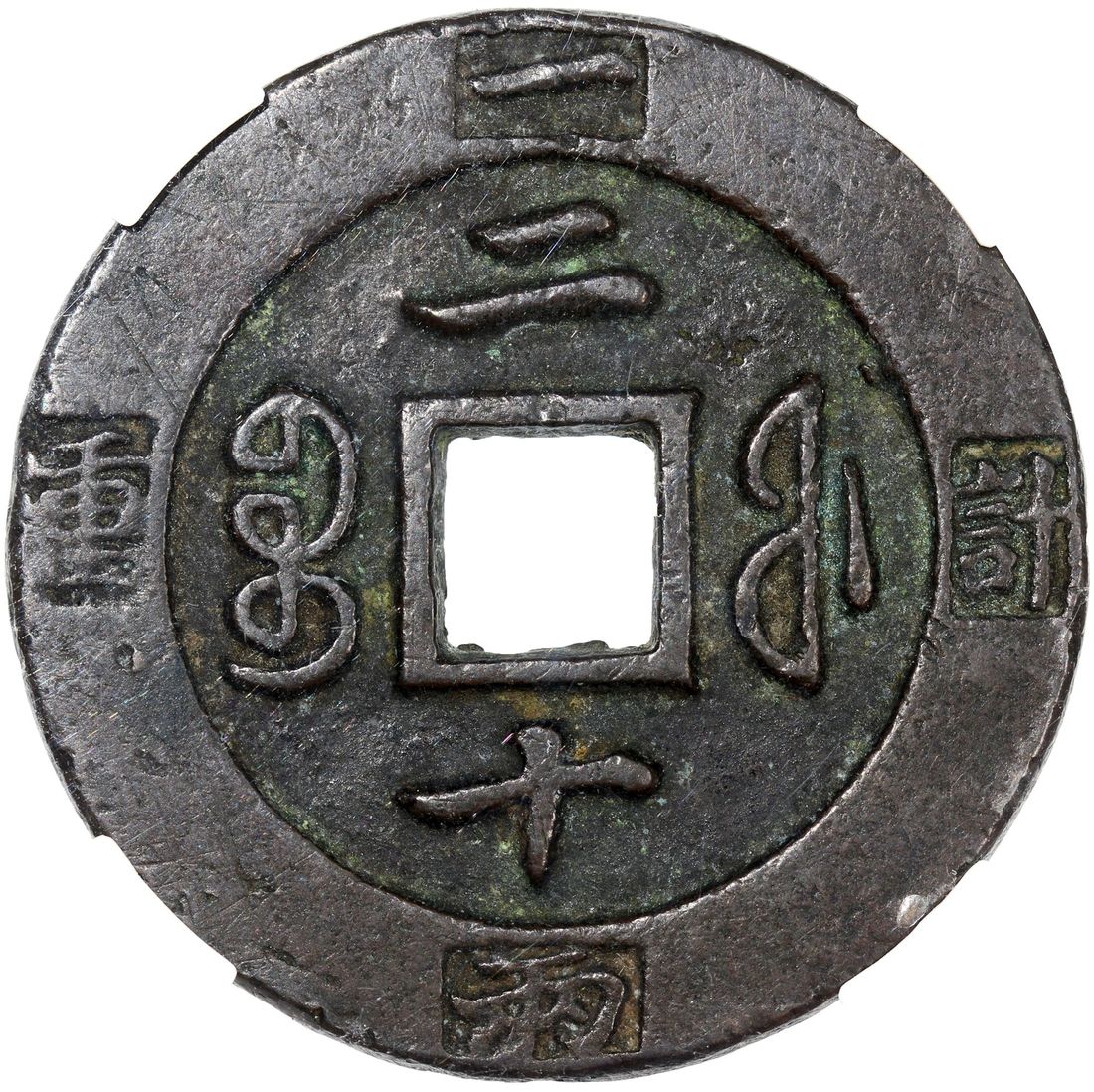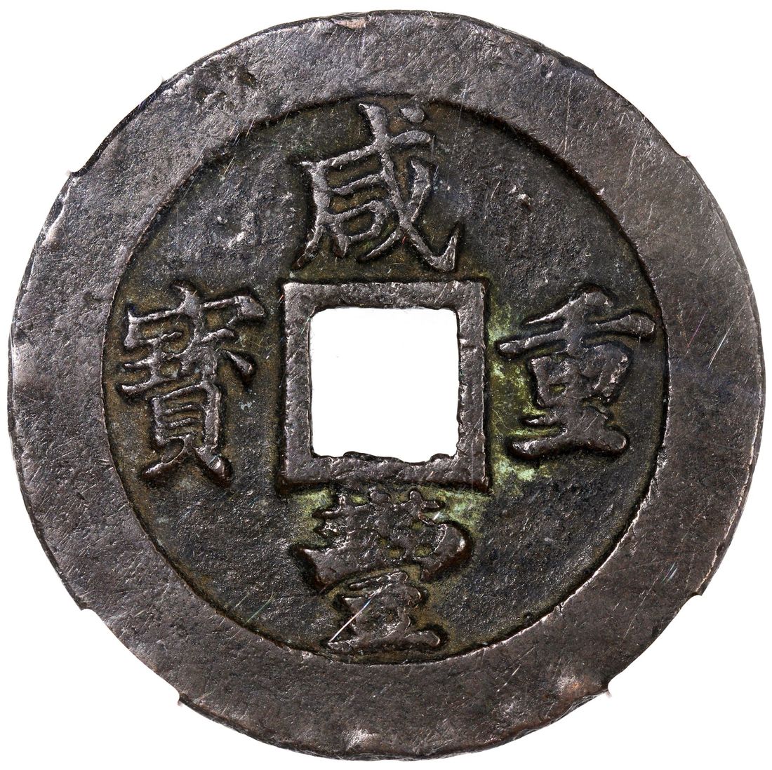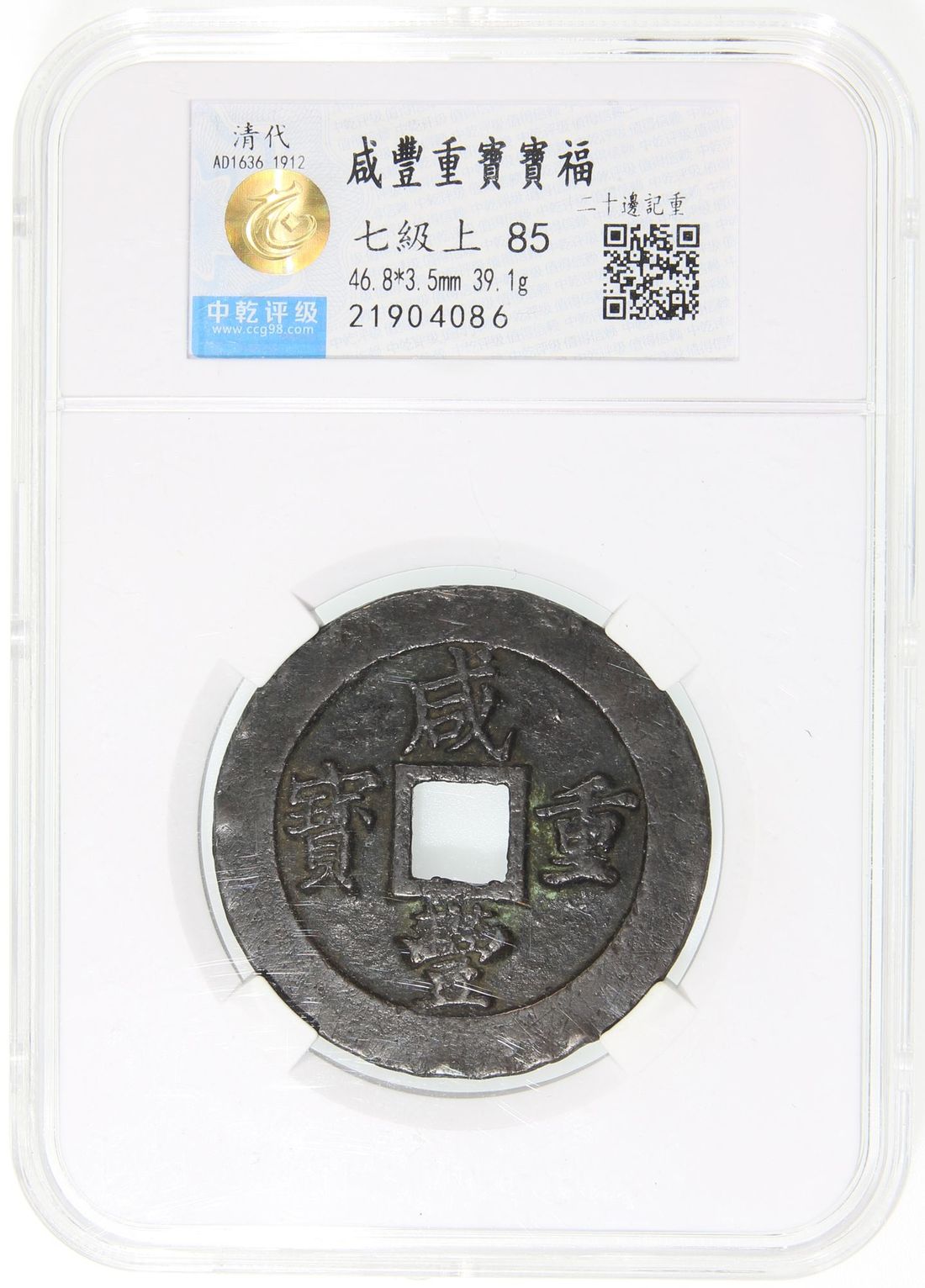 China, Qing Dynasty, [Zhong Qian 85] copper 20 cash, 'Xiang Feng Zhong Bao', 1853-1861, 'Bao Fu' (Fukien Province) mint, Chinese characters 'Ji Zhong Yi Liang' on outer border on reverse, 46.8x3.5mm, weighs 39.1g, rare and in excellent condition, the 'Ji Zhong Yi Liang' on the outer border being exclusive to Bao Fu mint
