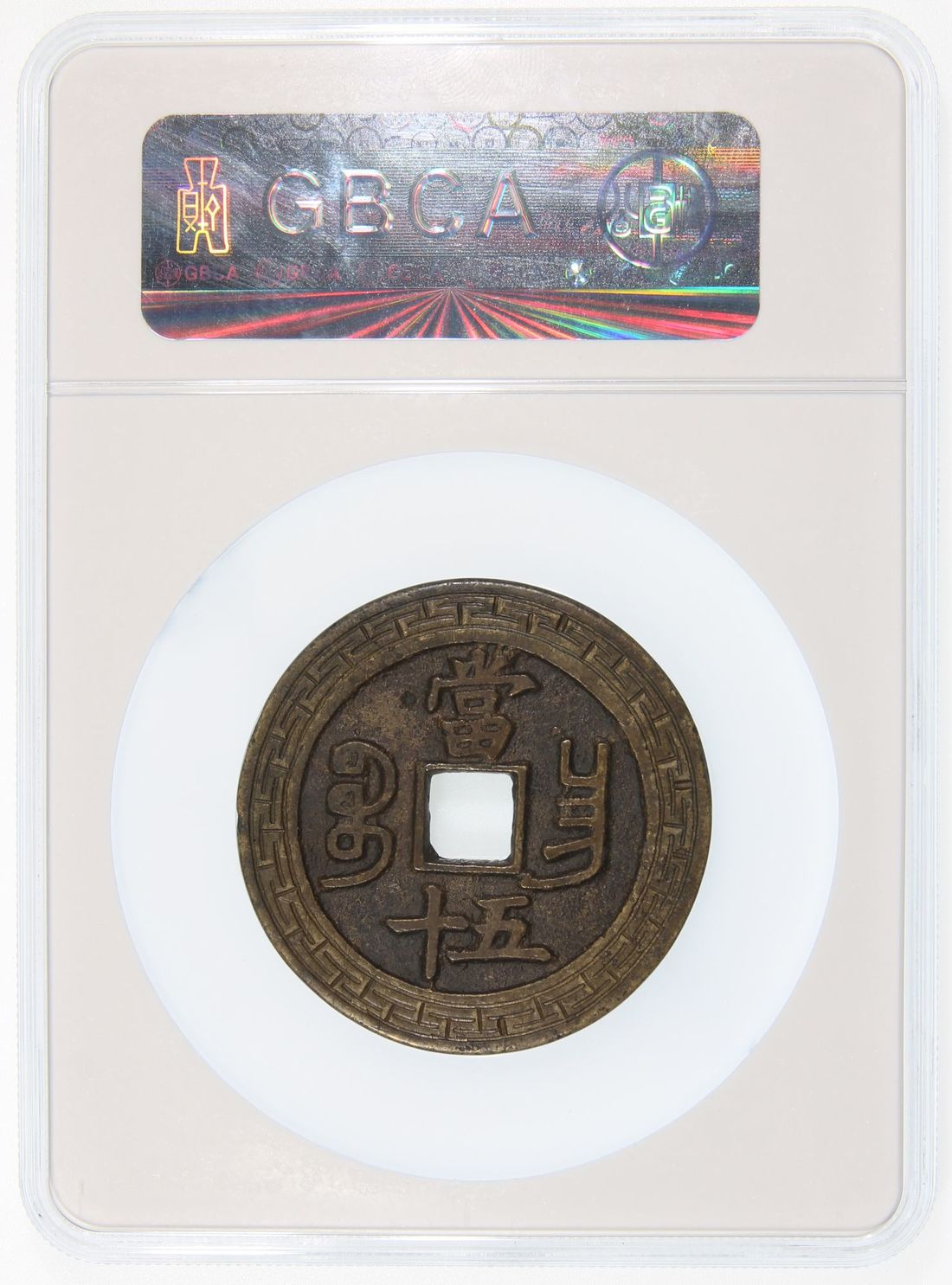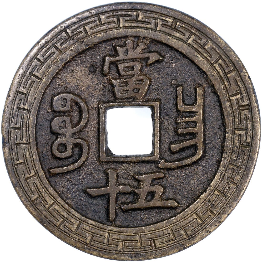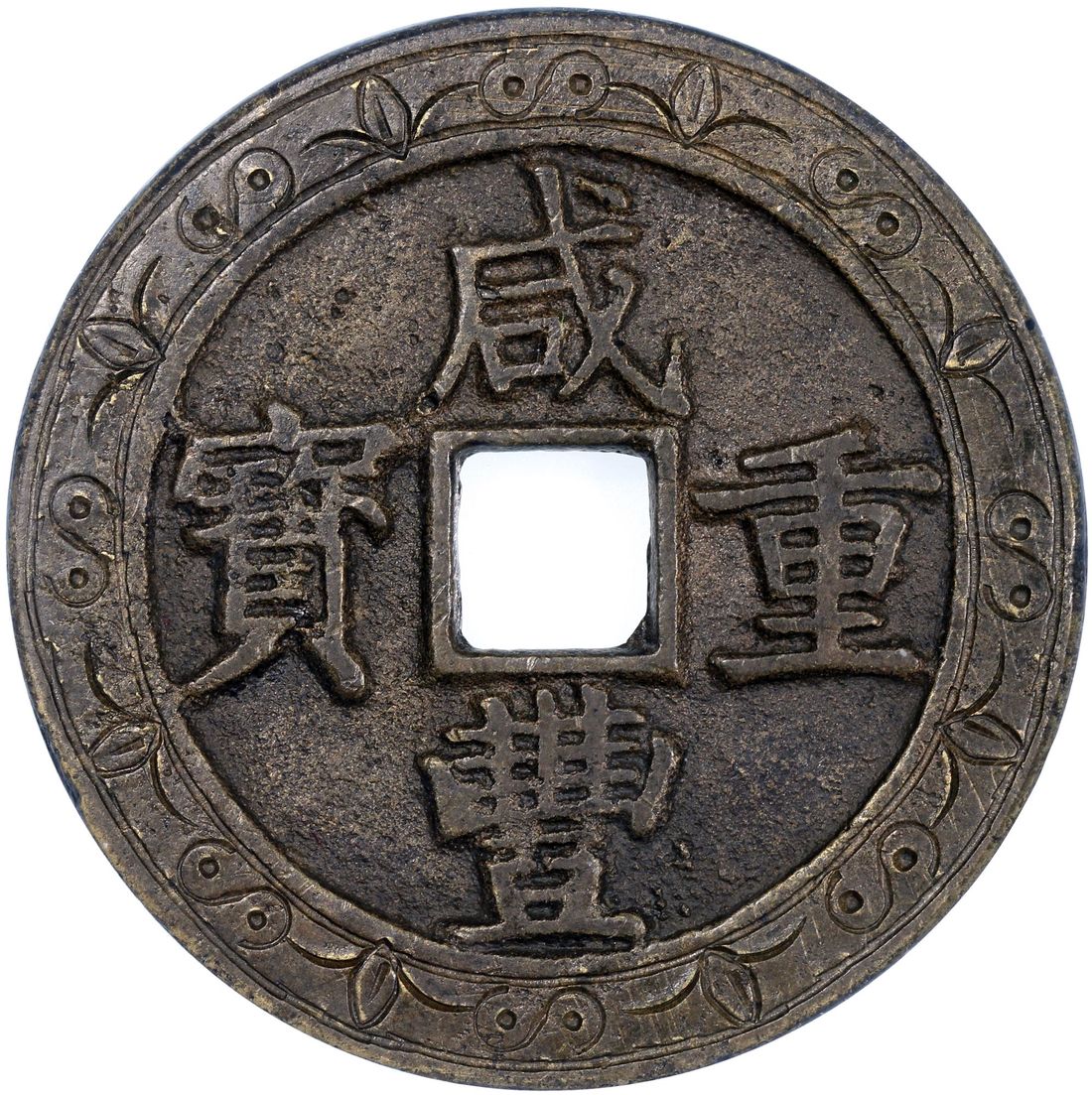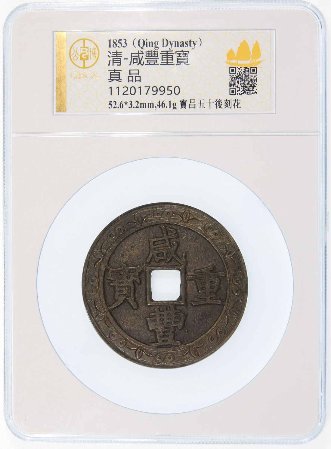China, Qing Dynasty, [GBCA Genuine] brass 50 cash, 'Xian Feng Zhong Bao', 1853-1861, 'Bao Chang' (Kiangsi) mint, 52.6 x 3.2mm, weighs 46.1g. Engraving added later, but still an eye appealing piece and fairly ornate