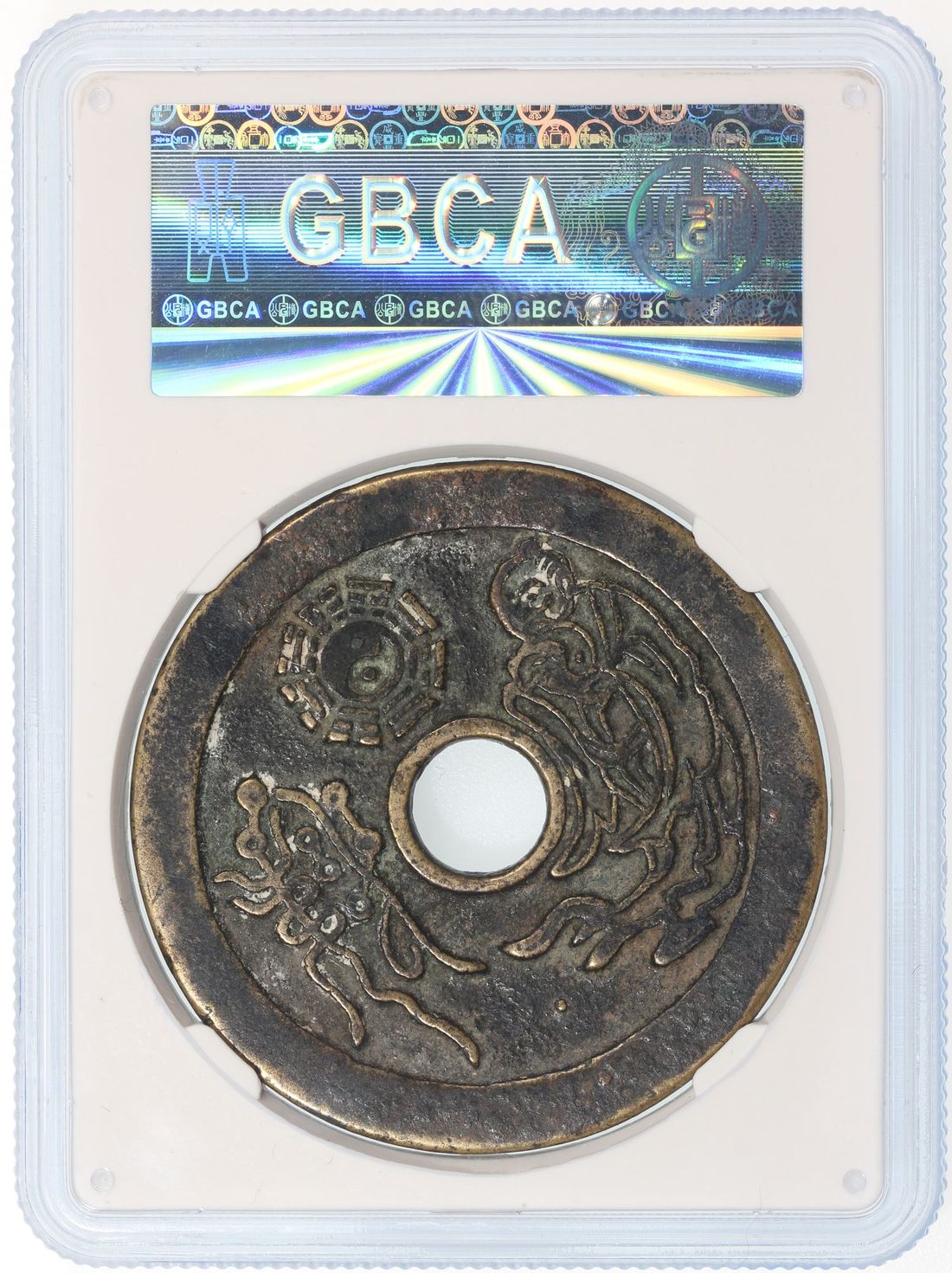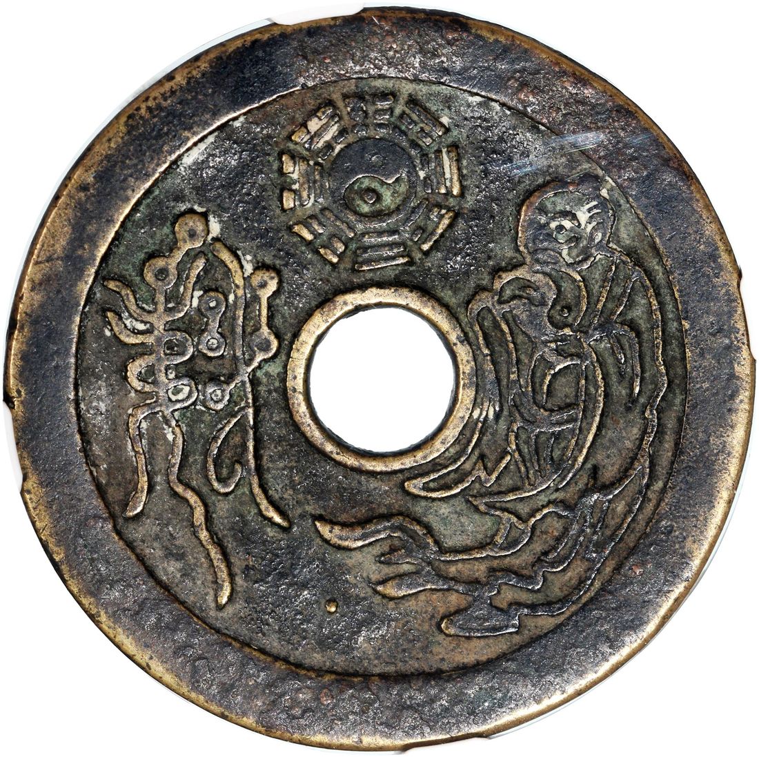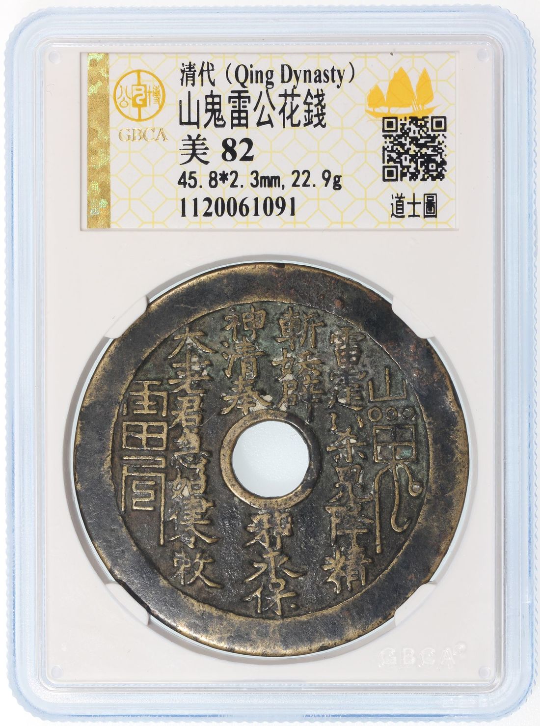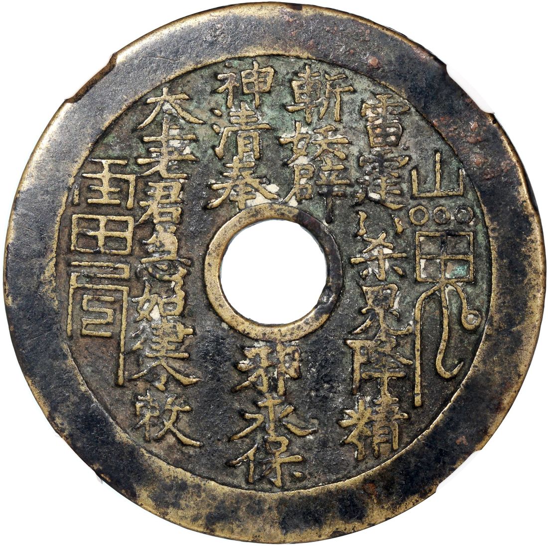 China, Qing Dynasty, [GBCA 82] copper charm coin, 'Shan Gui Lei Ting', round centre hole, , 'Tai Shang Lao Jun' on reverse, 45.8x2.3mm, weighs 22.9g,