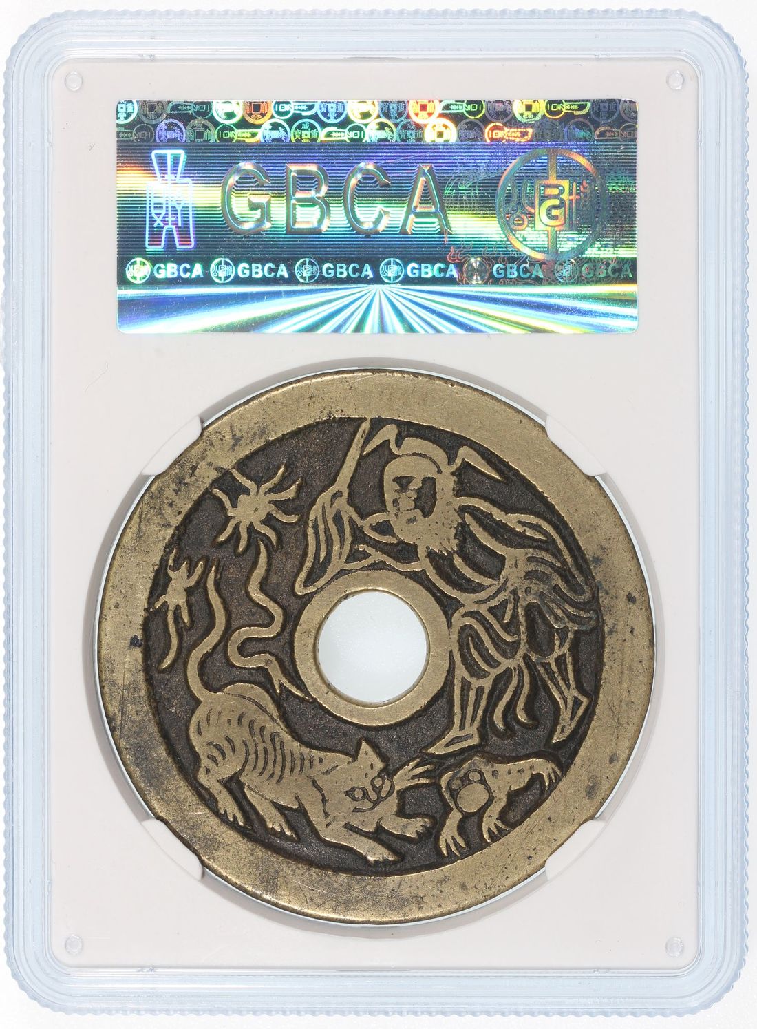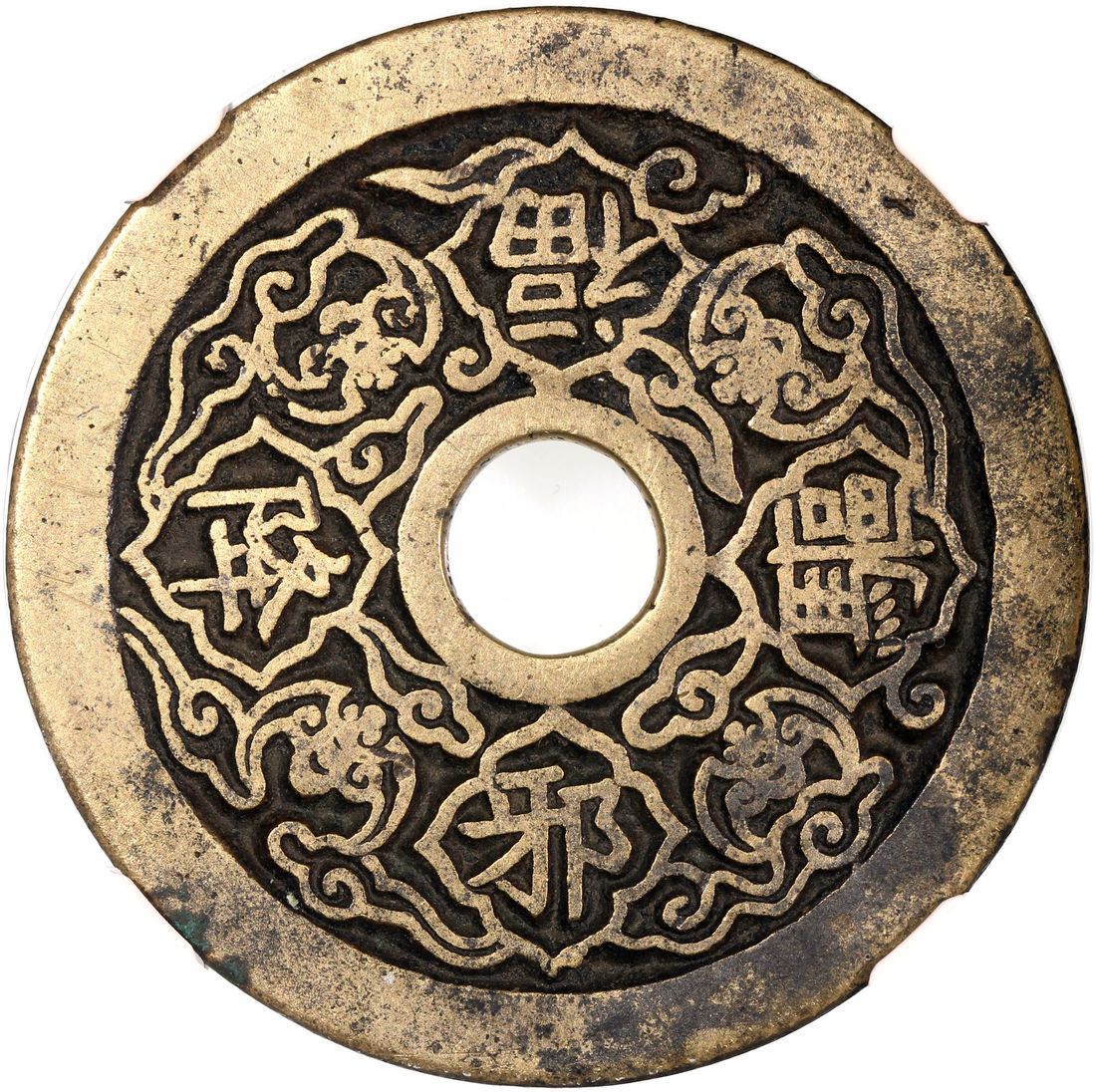 China, Qing Dynasty, [GBCA 82] coin-shaped charm with round central hole, obverse inscribed 'Qu Xie Xiang Fu', reverse scene of Zhong Kui vanquishing the Five Poisons, 45.7x2.2mm, weighs 24.9g
