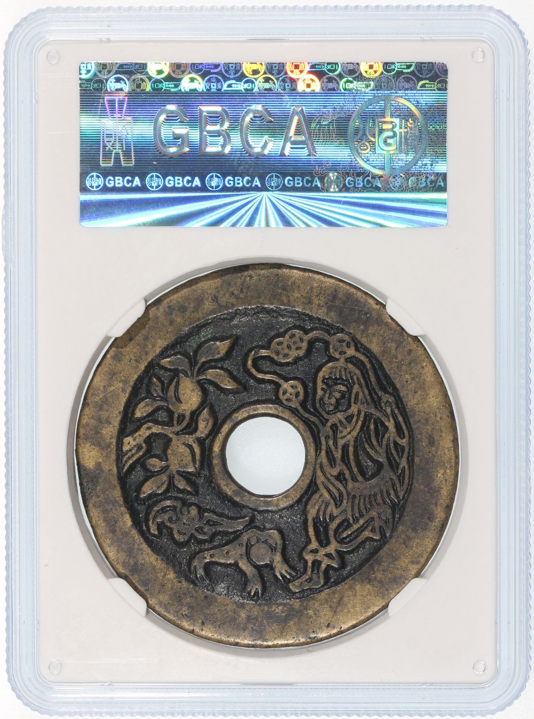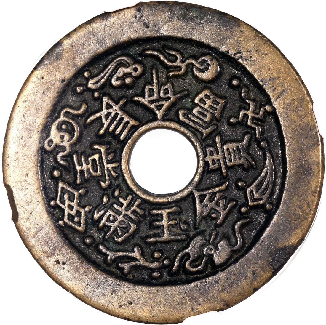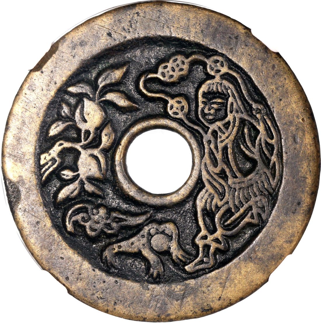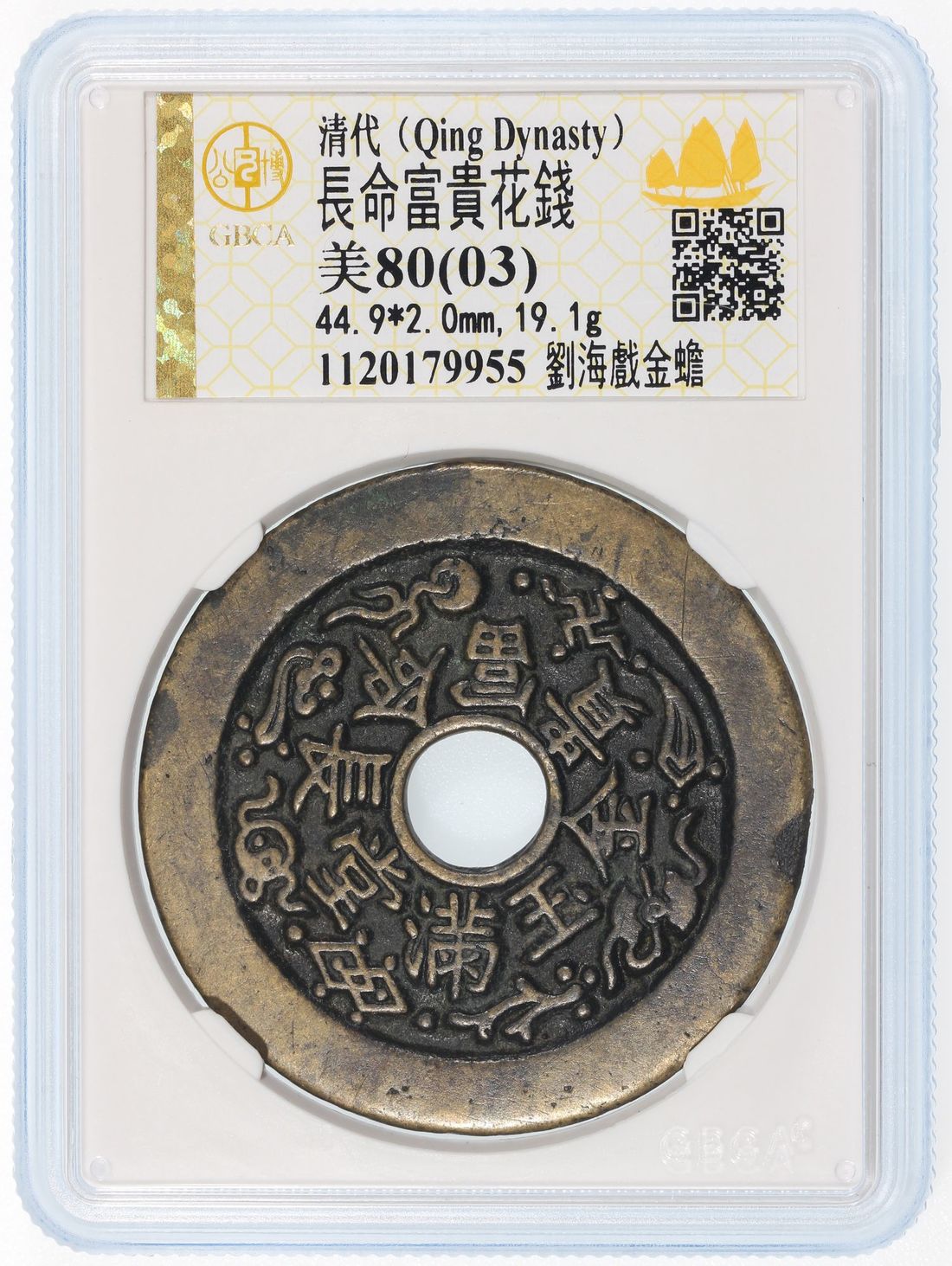 China, Qing Dynasty, [GBCA 80] coin-shaped charm with round central hole, obverse inscribed 'Chang Ming Fu Gui Jin Yu Man Tang' decorated with eight treasures, Liu Hai playing with three-legged toad, 44.9x2.0mm, weighs 19.1g. Repaired