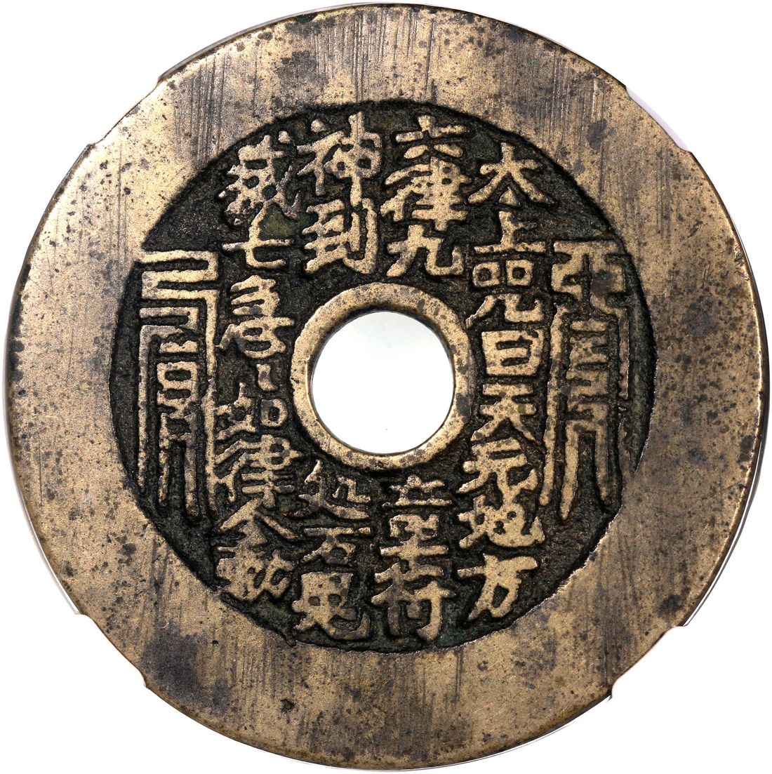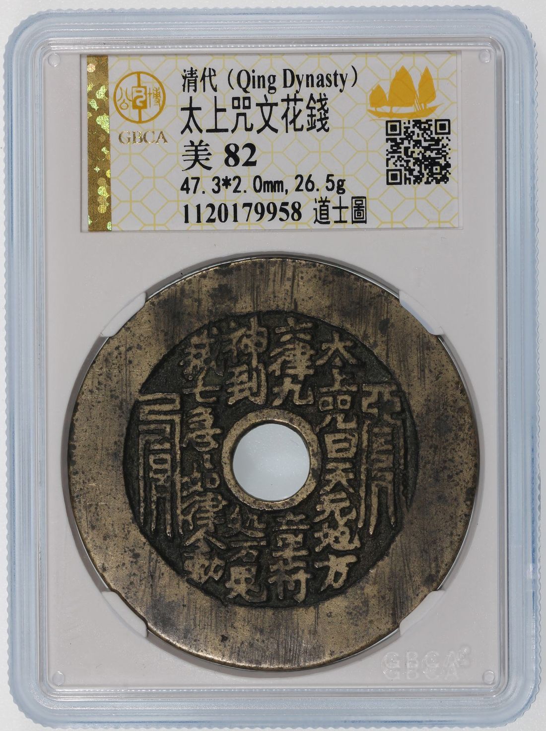 China, Qing Dynasty, [GBCA 82] coin-shaped charm with round central hole, obverse inscribed with Taoist spell 'Tai Shang Zhou', Taoist spell script with Taoist god Taishang Laojun and bagua on reverse, 47.3x2.0mm, weighs 26.5g