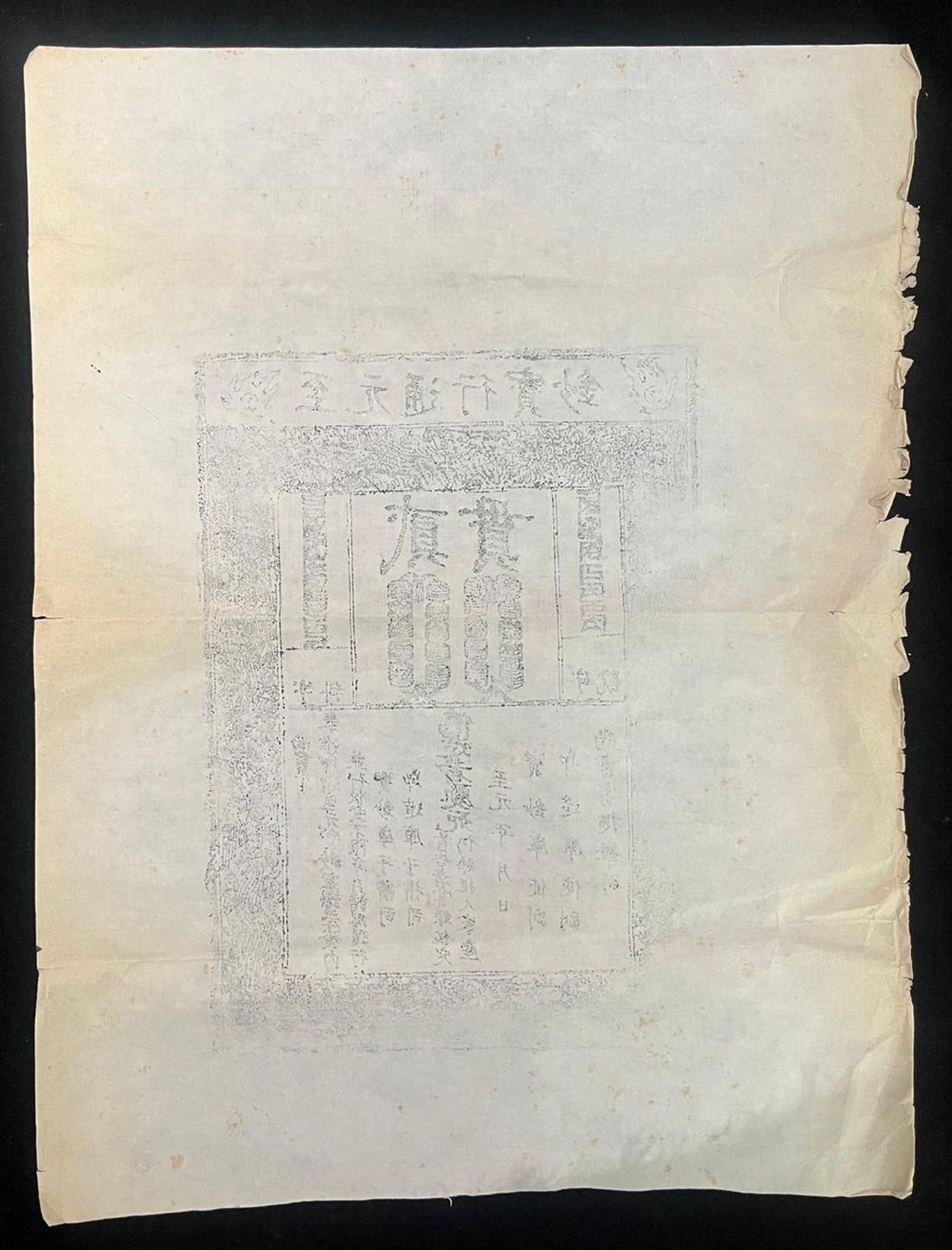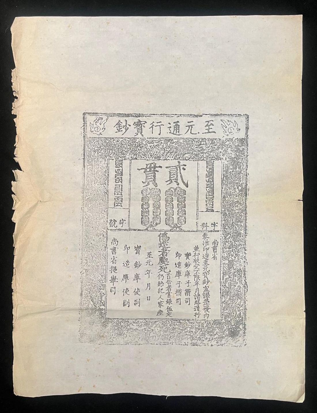 China, Yuan Dynasty, 2 kuan, 'Zhi Yuan Tong Xing Bao Chao', uniface vintage printout, ragged edges not affecting the design, well preserved, foxing around the edges, yellow spots, folding marks, viewing recommended, sold as is, from Luo Zemin family
