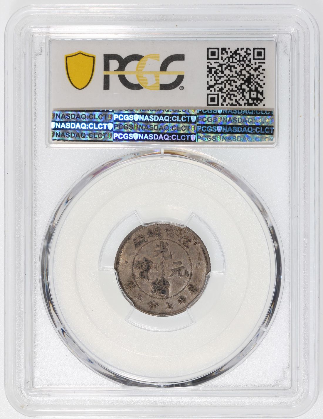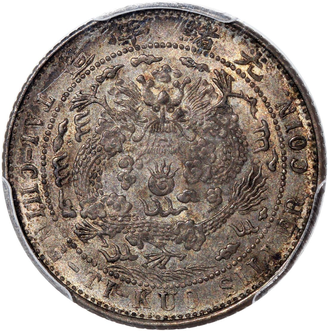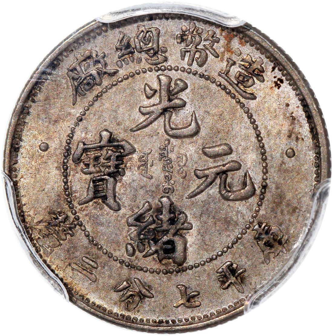China, Qing Dynasty, [PCGS AU58] silver 10 cents, ND (1908), 'Guang Xu Yuan Bao', dot at the end of tail variety, (LM-13, K-218), Cert. #37077605. A not often seen minor issue just at the cusp of mint state, toned in muted shades of grey and olive