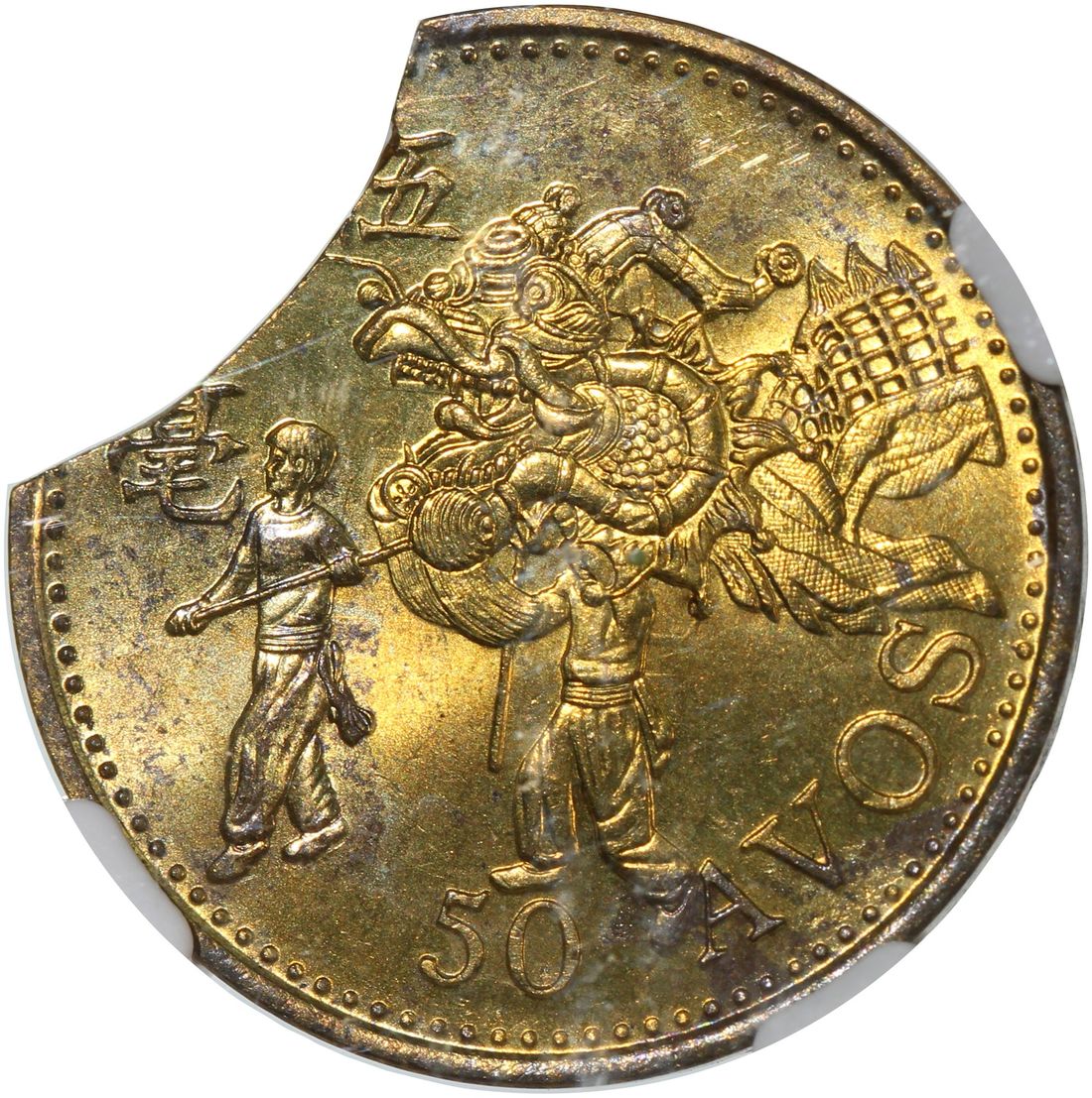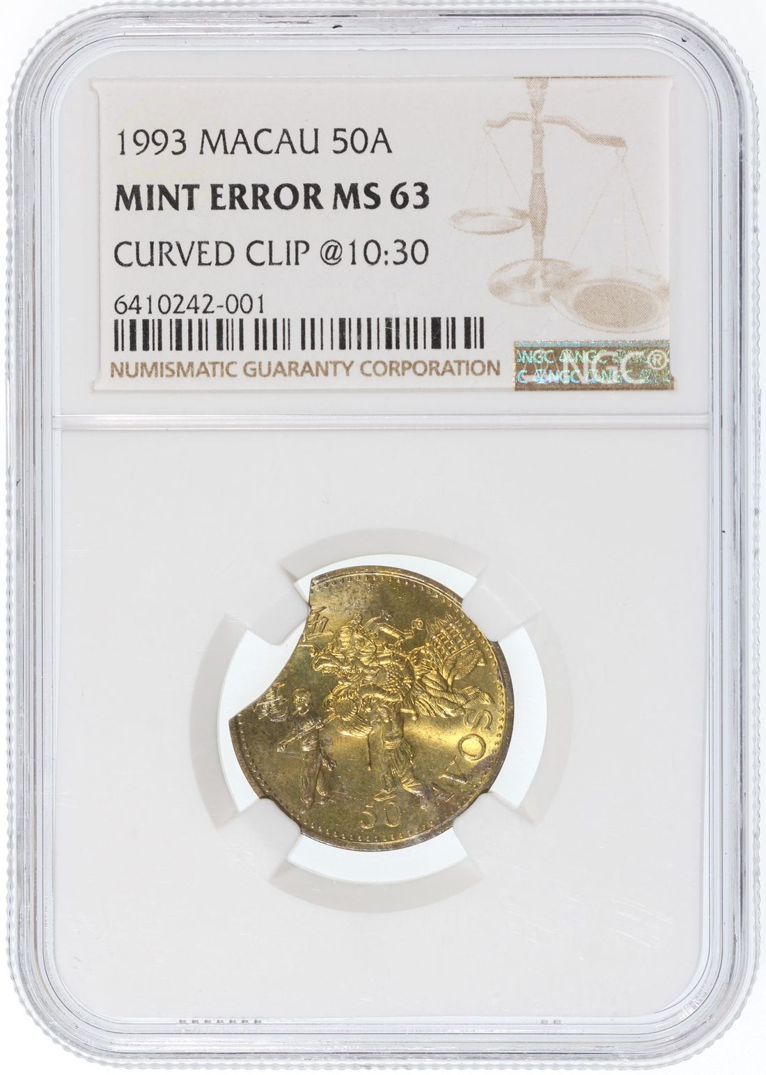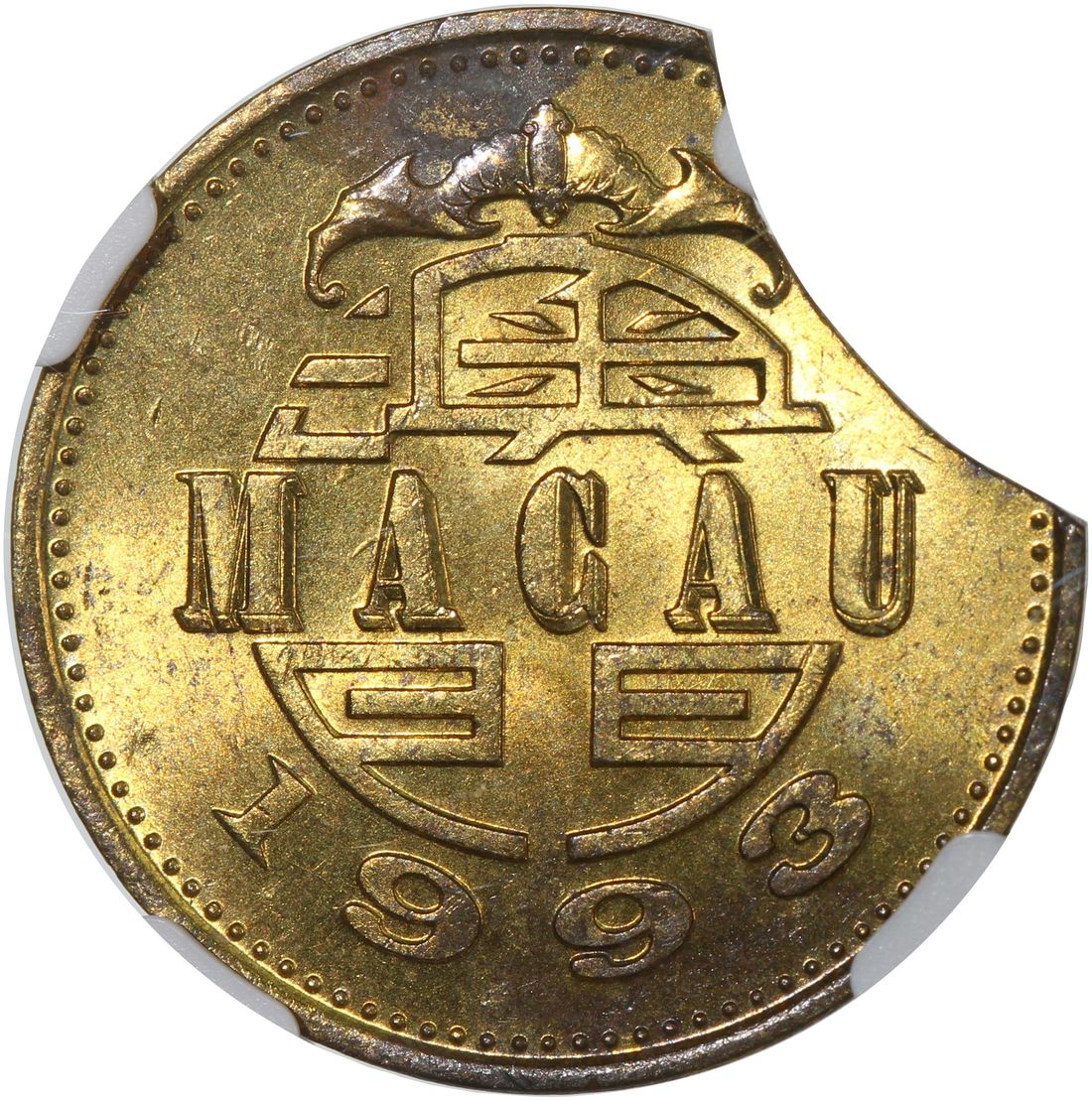 Macau, [NGC MS63] MINT ERROR copper 50 avos, 1993, curved clip at 10:30, Cert.# 6410242-001