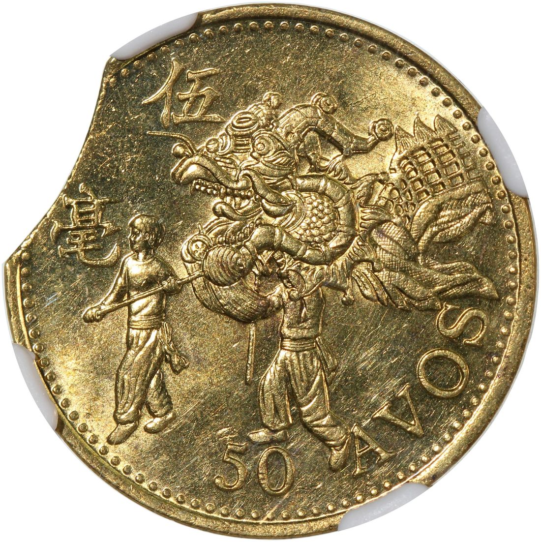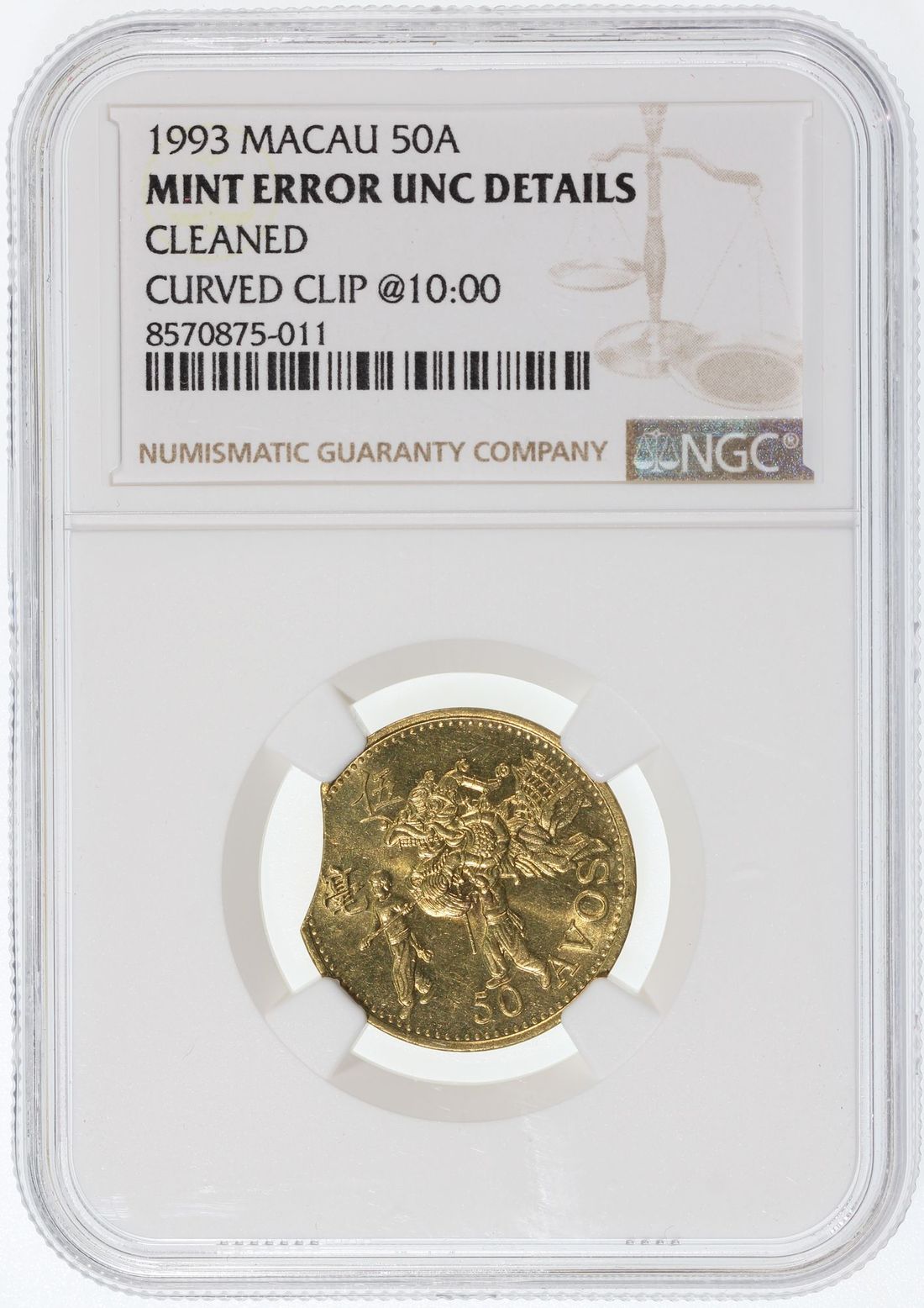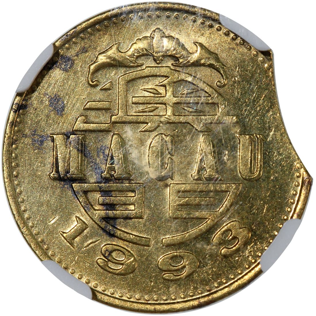 Macau, [NGC UNC Details] MINT ERROR copper 50 avos, 1993, curved clip at 10:00, cleaned. Cert.# 8570875-011