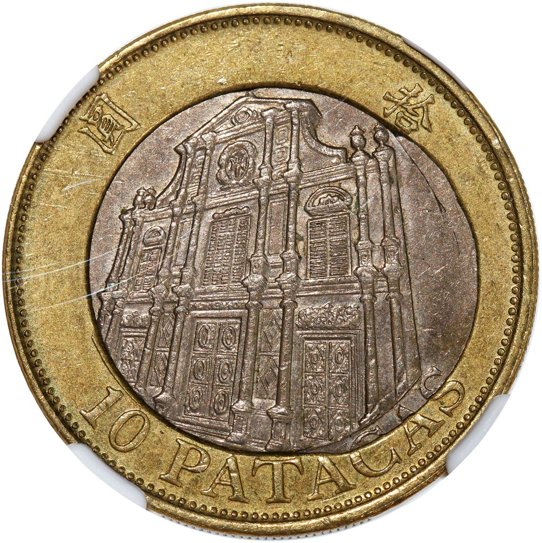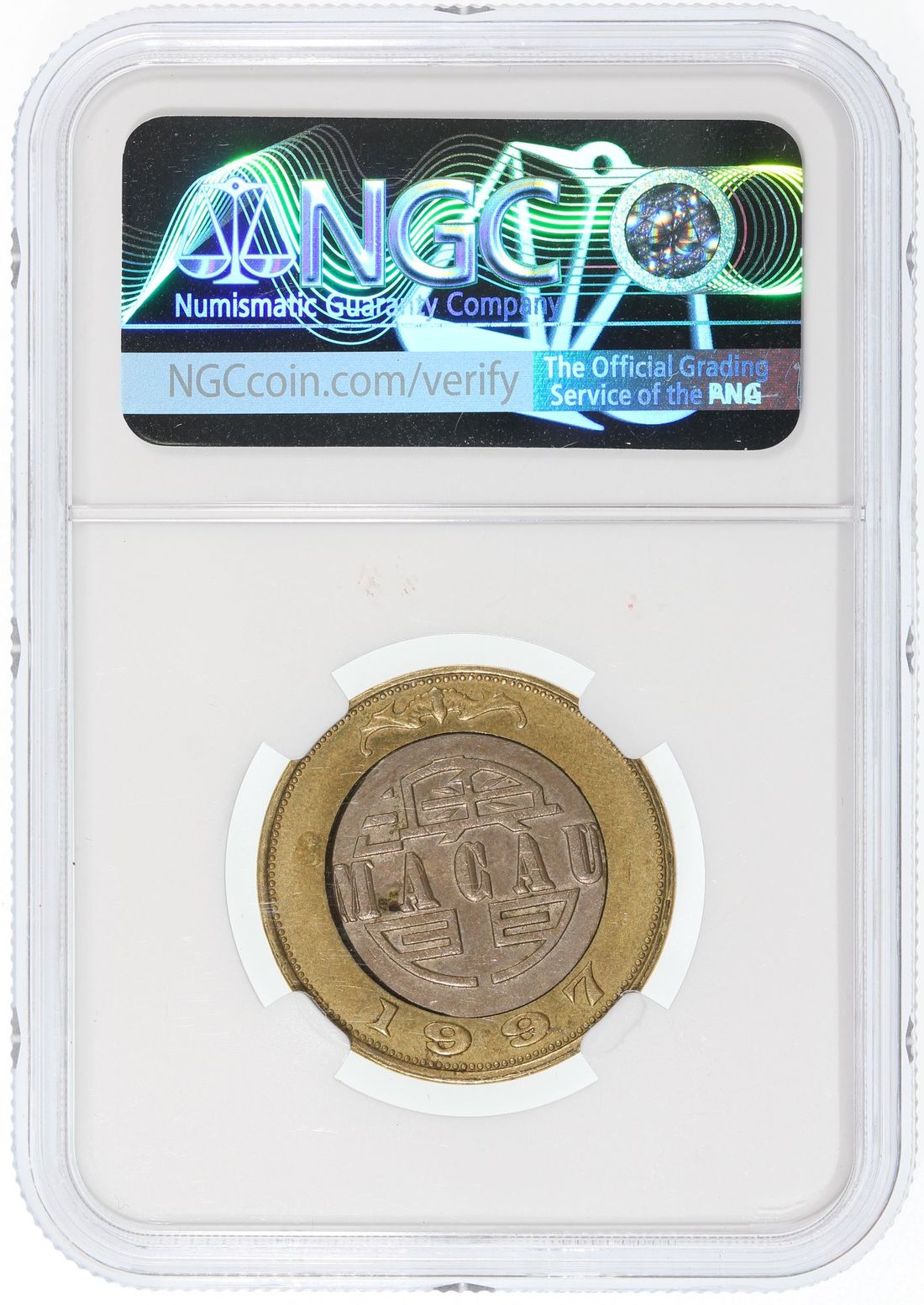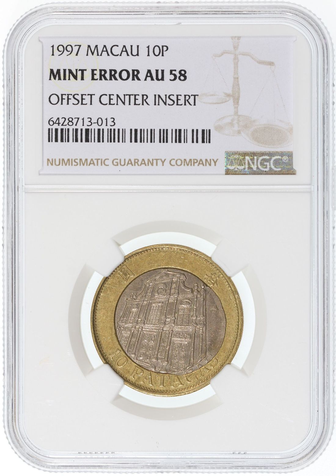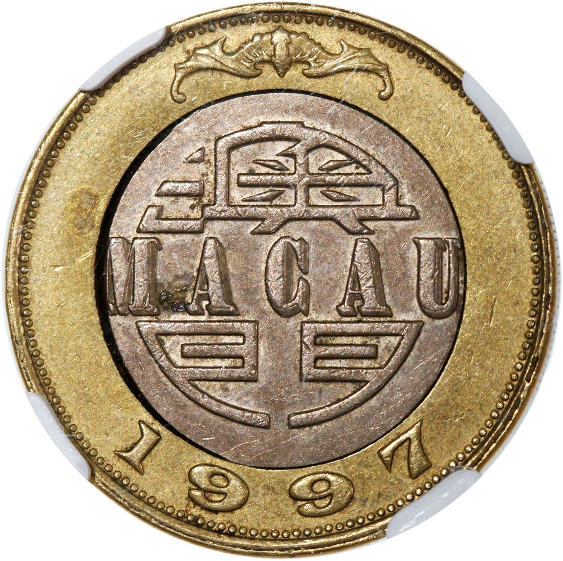 Macau, [NGC AU58] MINT ERROR copper nickel 10 patacas, 1997, offset centre insert, Cert.# 6428713-013