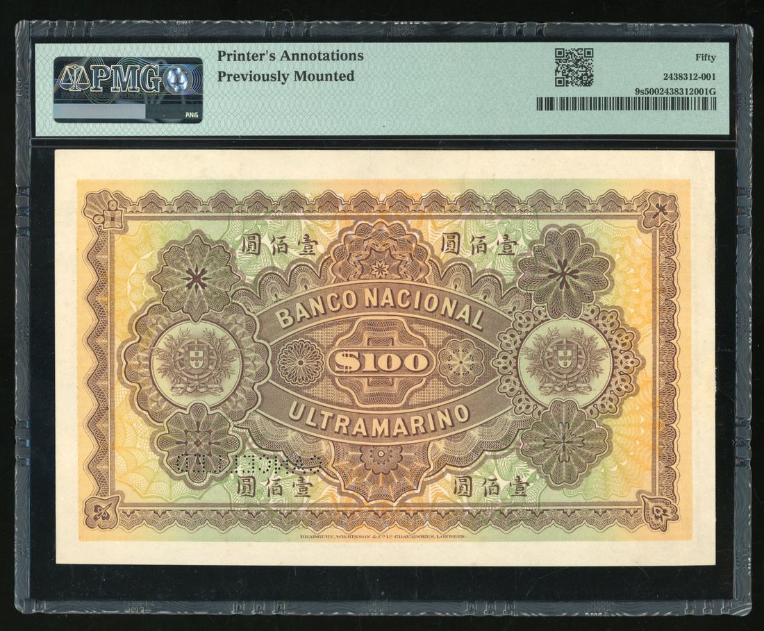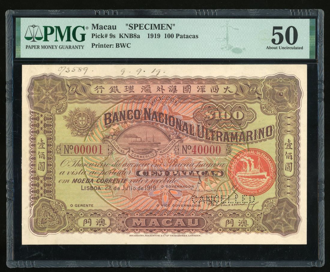 Banco Nacional Ultramarino, Macau, specimen 100 patacas, 22.7.1919, red serial number 00001-40000, purple-brown, pale green and pink, steamship left centre, arms top left, red steamship seal at right, MACAO in tablet low centre, reverse purple-brown, orange and green, value at centre, arms at left and right