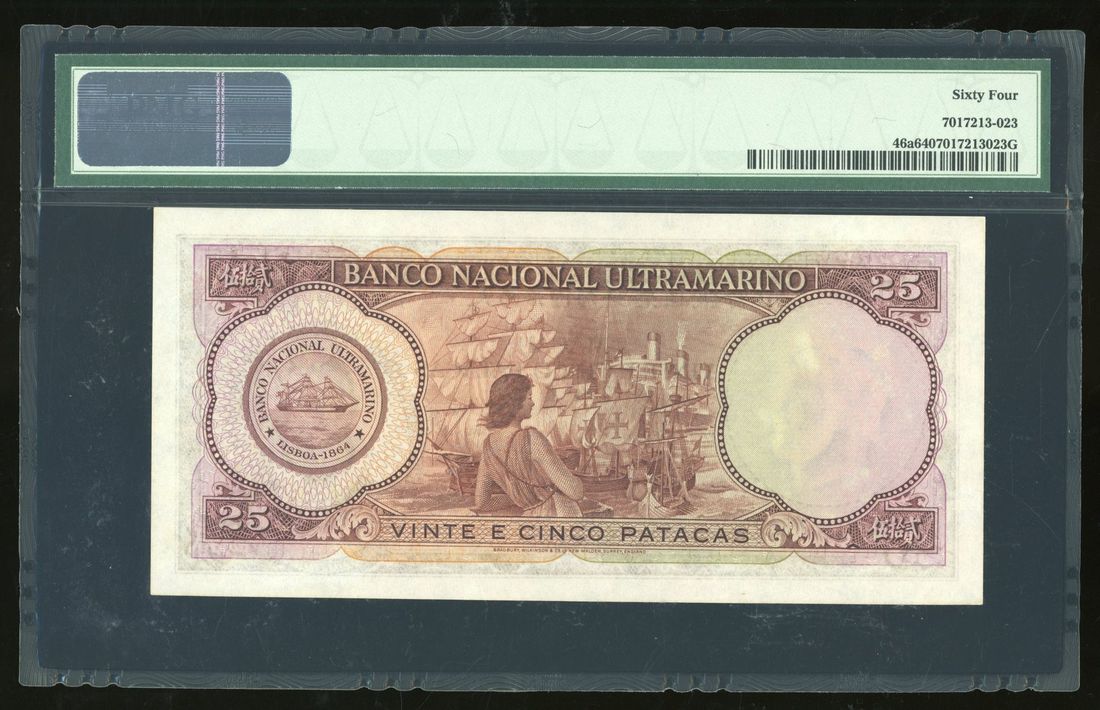 Banco Nacional Ultramarino, Macau, 25 patacas, 1958, serial number B061279, brown on multicolour underprint, Camoes at right, arms at bottom centre,