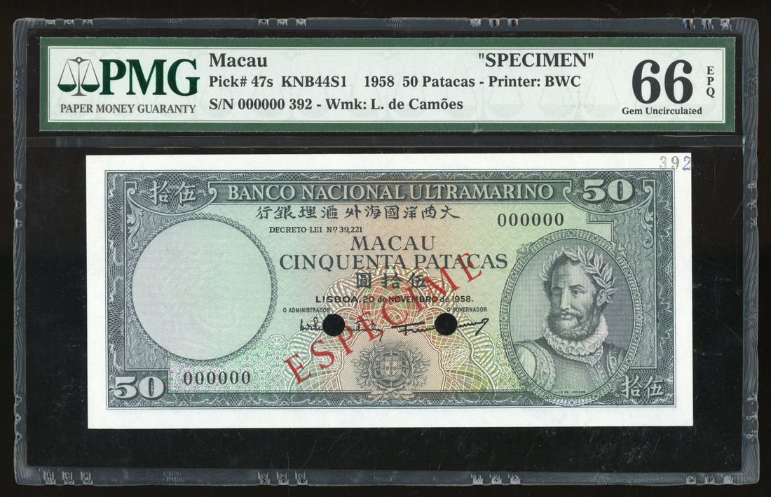 Banco Nacional Ultramarino, Macau, specimen 50 patacas, 20.11.1958, serial number 000000, blue-grey on pale green, '50' at each corner, de Camoes at right, reverse blue, green and pink, maiden watching departing ships at centre,