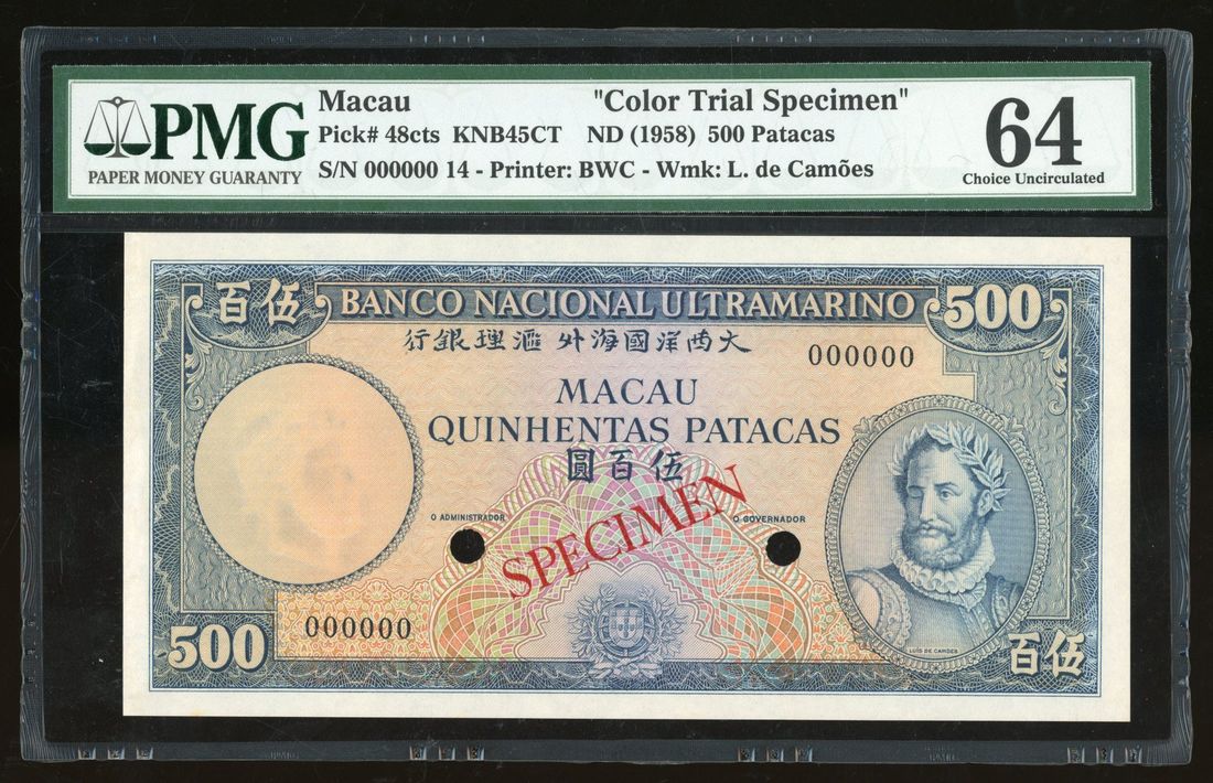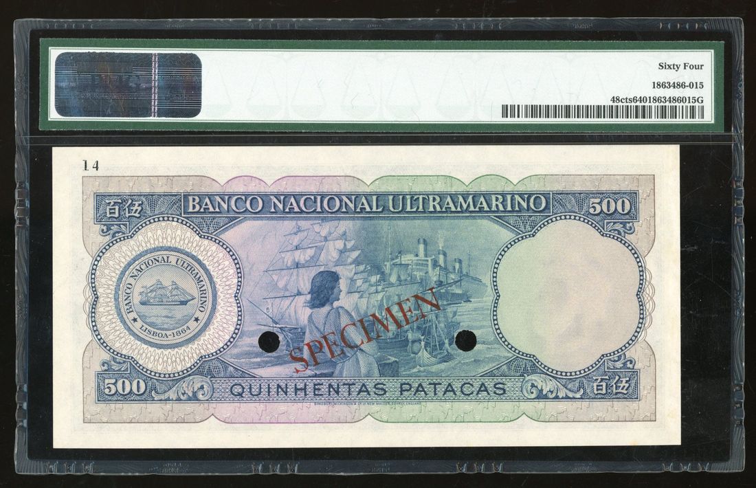 Banco Nacional Ultramarino, Macau, colour trial specimen 500 patacas, ND (1958), serial number 000000, blue and orange, issued note in green,