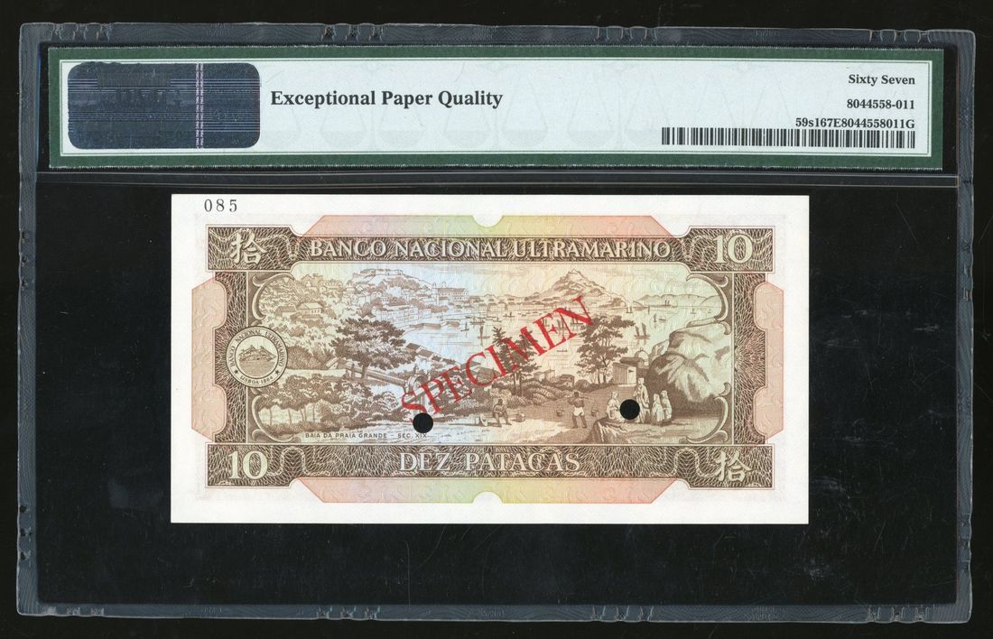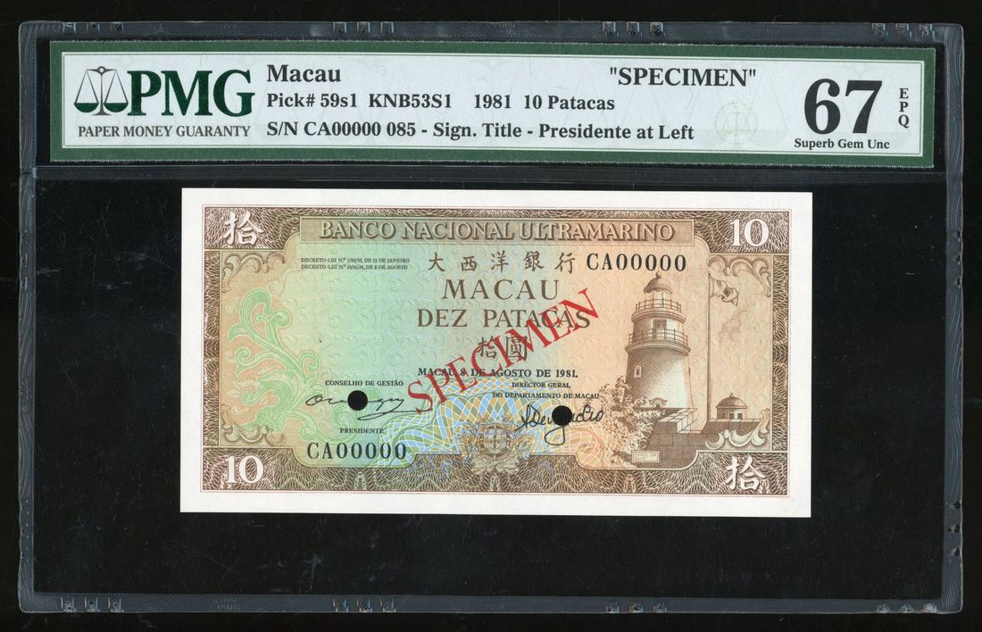 Banco Nacional Ultramarino, Macau, specimen 10 patacas, 1981, serial number CA00000, (Pick 59s), PMG 67EPQ. PMG 2nd highest grade with only 4 better