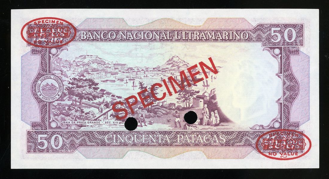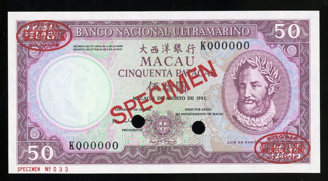 Banco Nacional Ultramarino, Macau, specimen 50 patacas, 8.8.1981, serial number KQ000000 033, (Pick 60s), about uncirculated. Specimens without DLR stamp are usually seen.