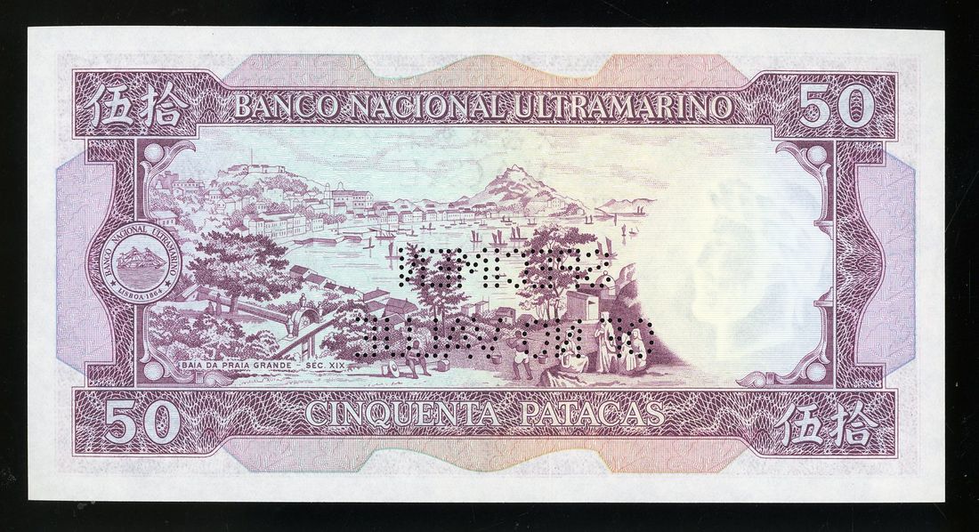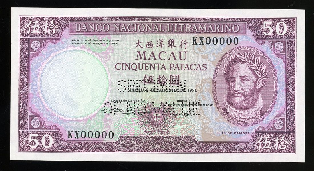 Banco Nacional Ultramarino, Macau, specimen 50 patacas, 8.8.1981, serial number KX000000, (Pick 60s), good extremely fine. Interesting type with perforations only and without any overprints.