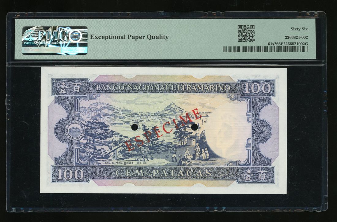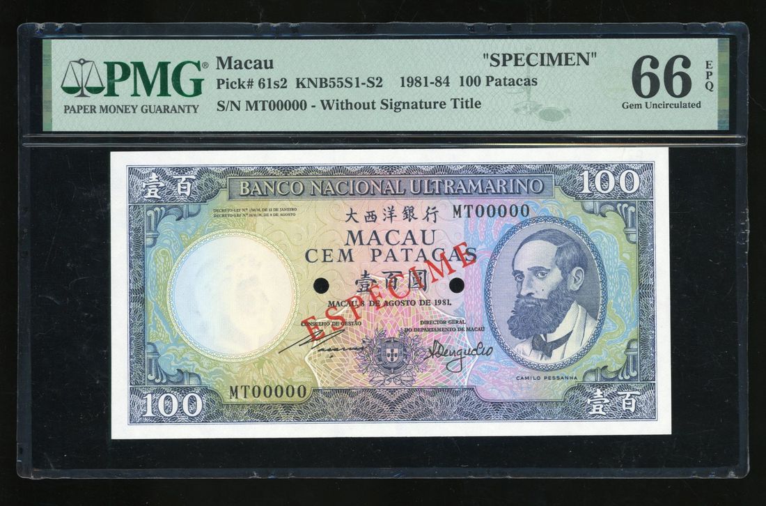 Banco Nacional Ultramarino, Macau, specimen 100 patacas, 8.8.1981, serial number MT00000, (Pick 61s2), PMG 66EPQ. 1981 issue scarcer than 1984. PMG census 3rd highest grade with only 11 better.