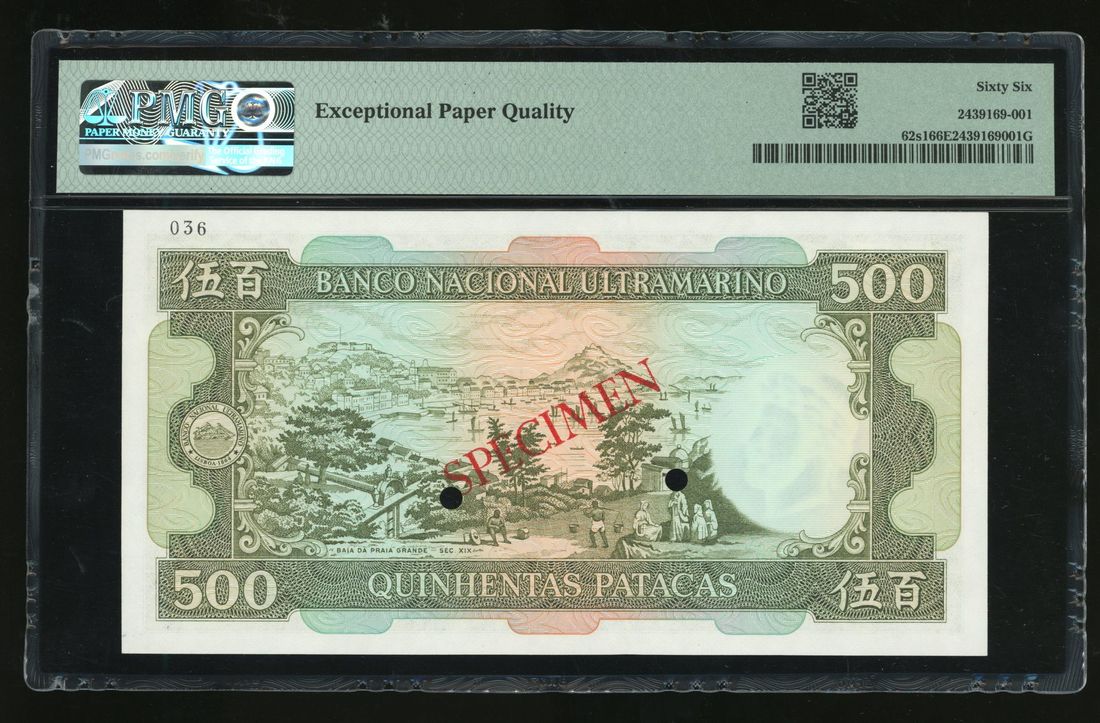 Banco Nacional Ultramarino, Macau, specimen 500 patacas, 8.8.1981, serial number NA000000 036, (Pick 62s1), PMG 66EPQ. Popular type