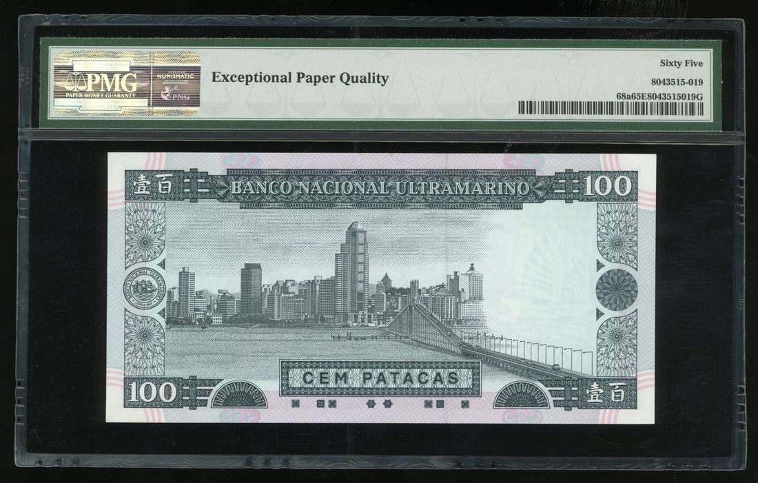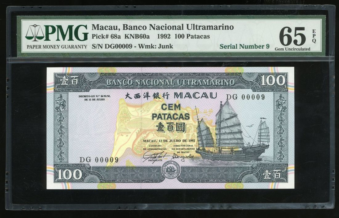 Banco Nacional Ultramarino, Macau, 100 patacas, 1992, low serial number DG00009, (Pick 68a), PMG 65EPQ