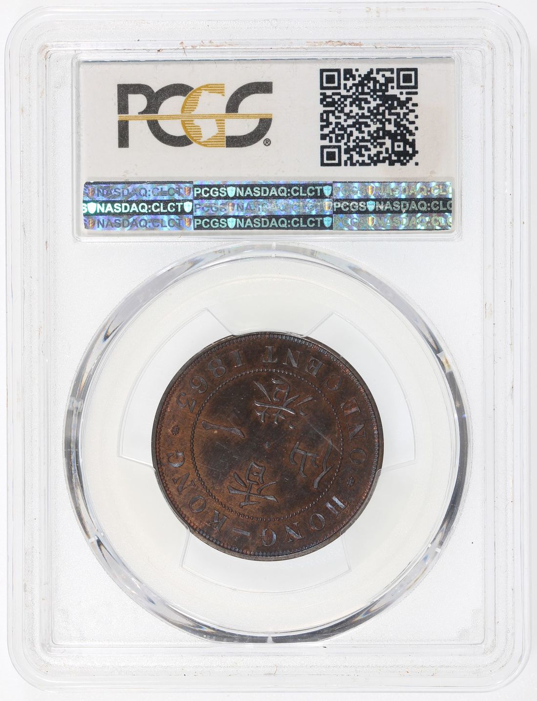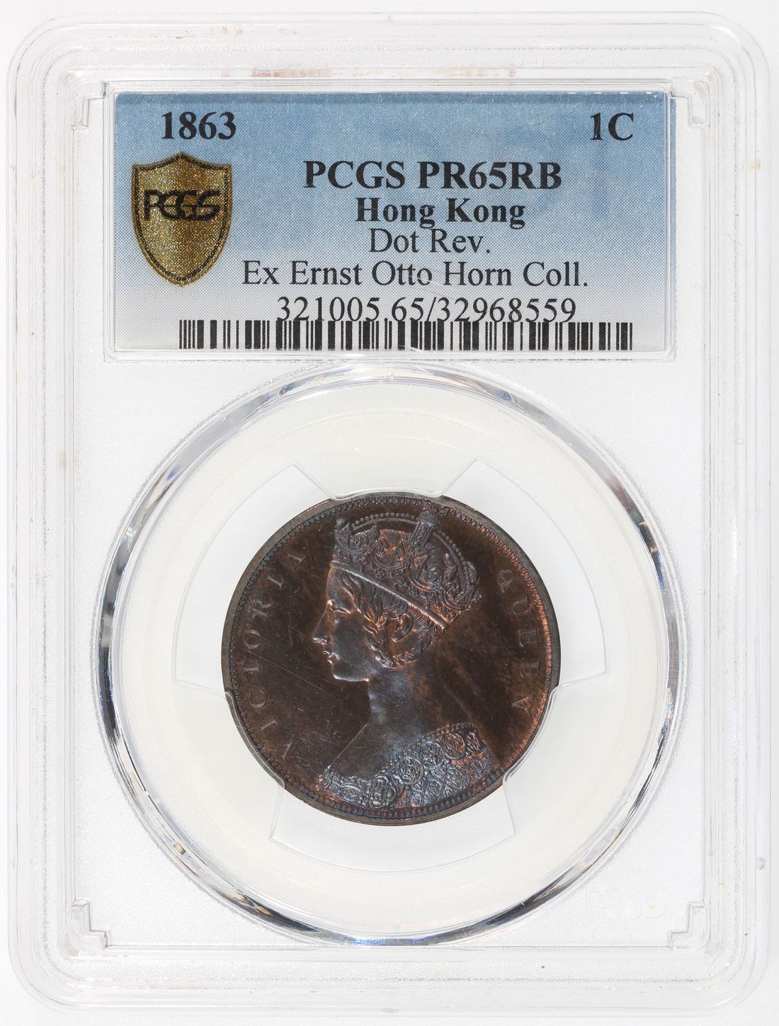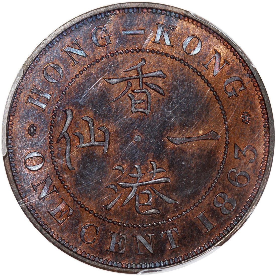 Hong Kong, [PCGS PR65RB] bronze proof 1 cent, 1863, Victoria on obverse, dot on reverse, (KM-4.1, Pridmore-165B), Cert. #32968559, an arresting piece with vivid steel blue toning interspersed with original red mint bloom. The highest grade in the PCGS census! Ex Ernst Otto Horn collection
