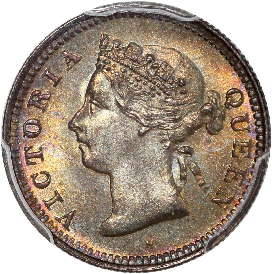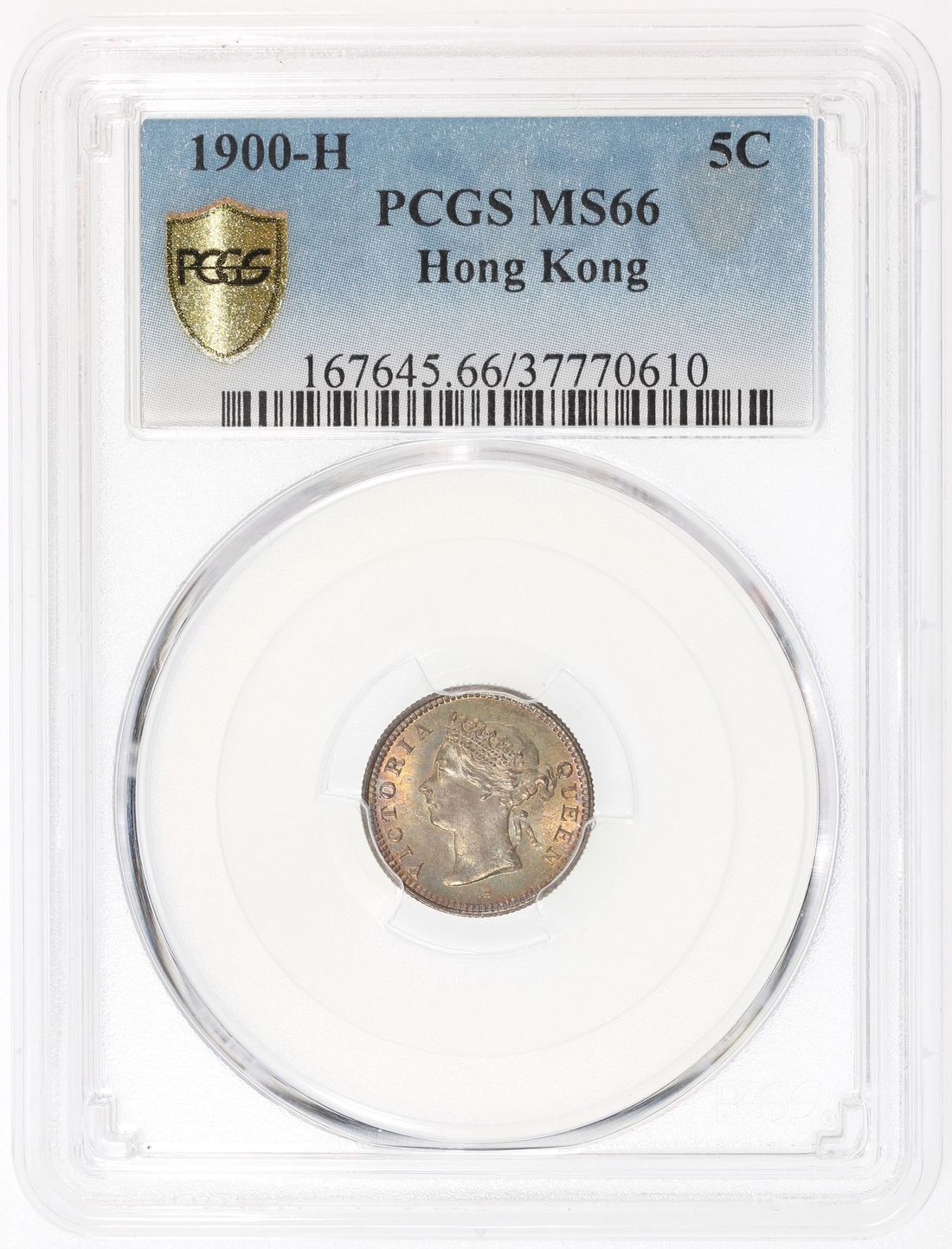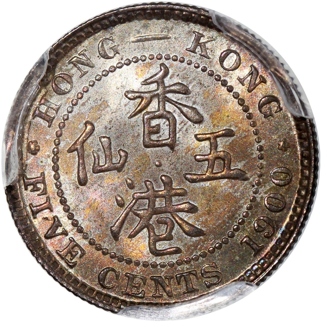 Hong Kong, [PCGS MS66] silver 5 cents, 1900H, Heaton mint, Victoria on obverse, (KM-5), Cert. #37770610, attractively toned in a radial gradient of seafoam green to brick red, only 6 graded higher in the PCGS population report
