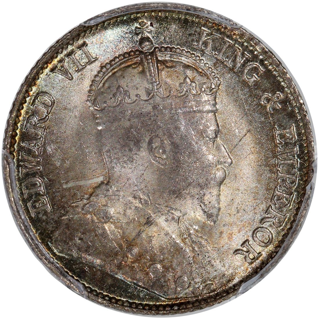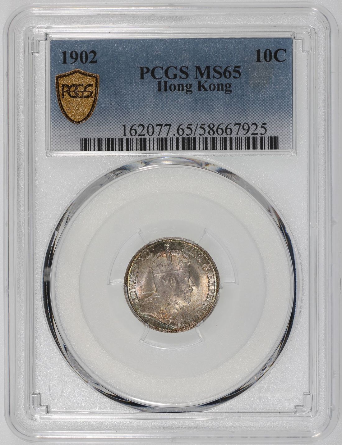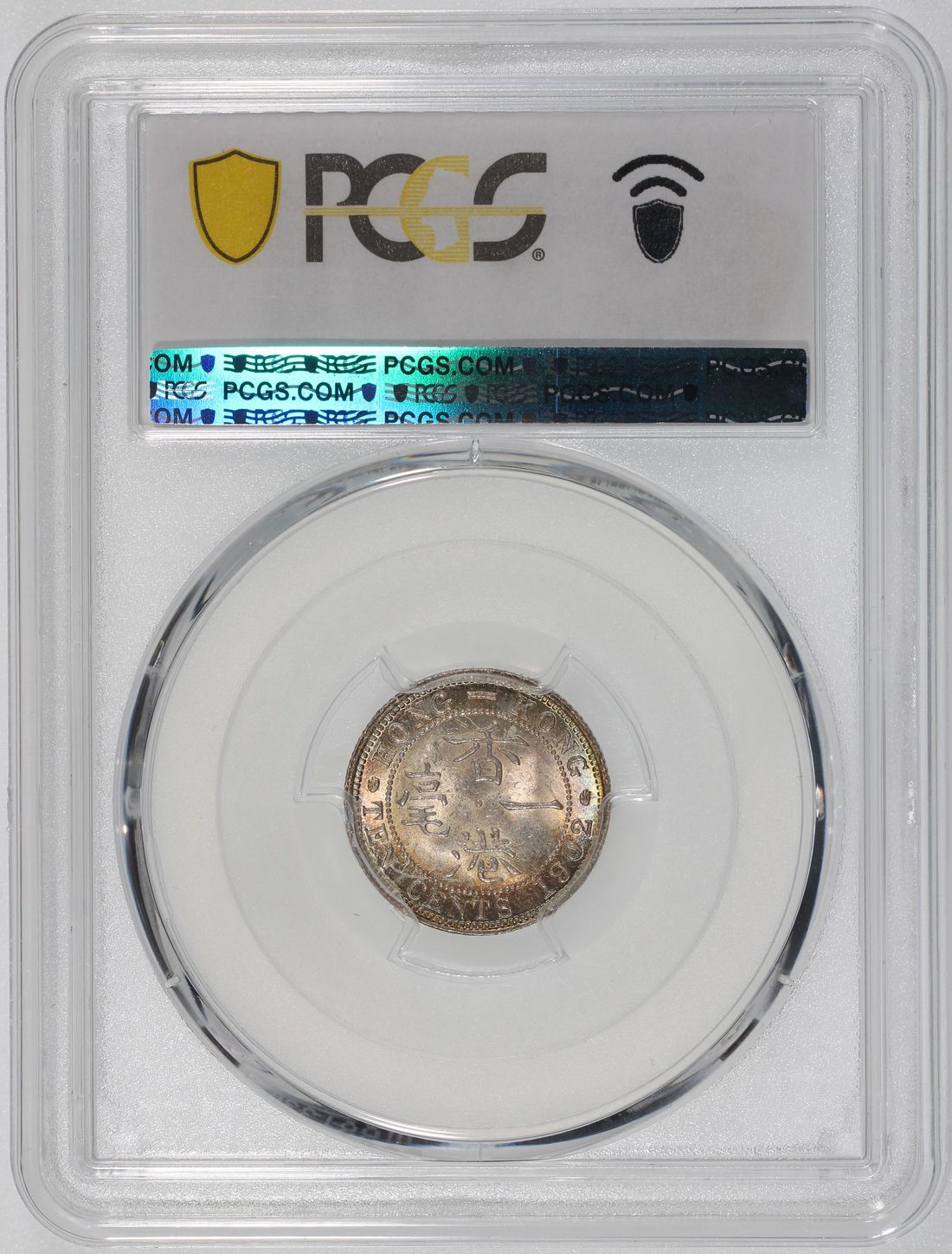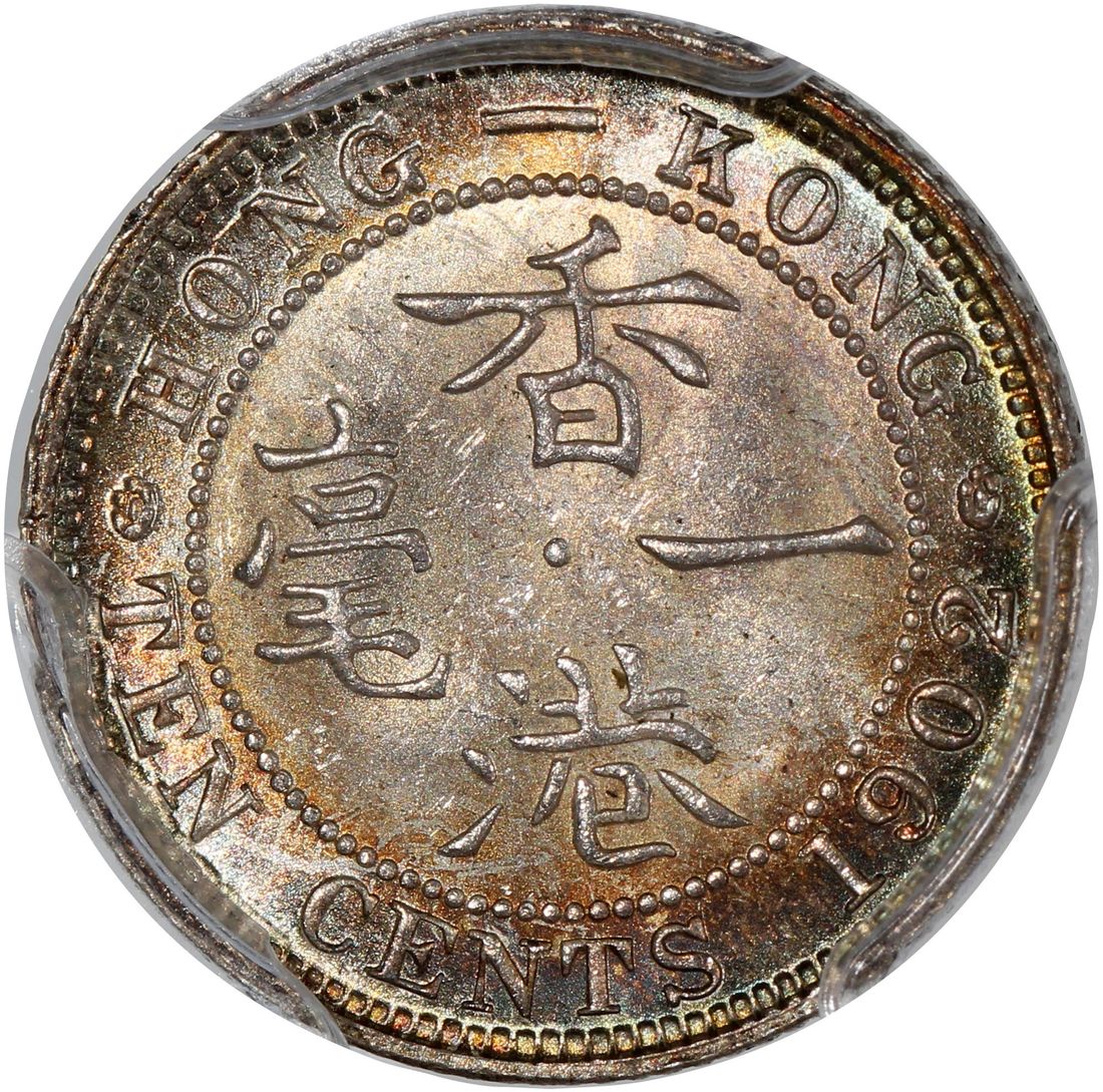 Hong Kong, [PCGS MS65] silver 10 cents, 1902, Edward VII on obverse, (KM-13), Cert. #58667925, attractive toning in bright teal, only 3 higher graded examples in the PCGS census as of cataloguing