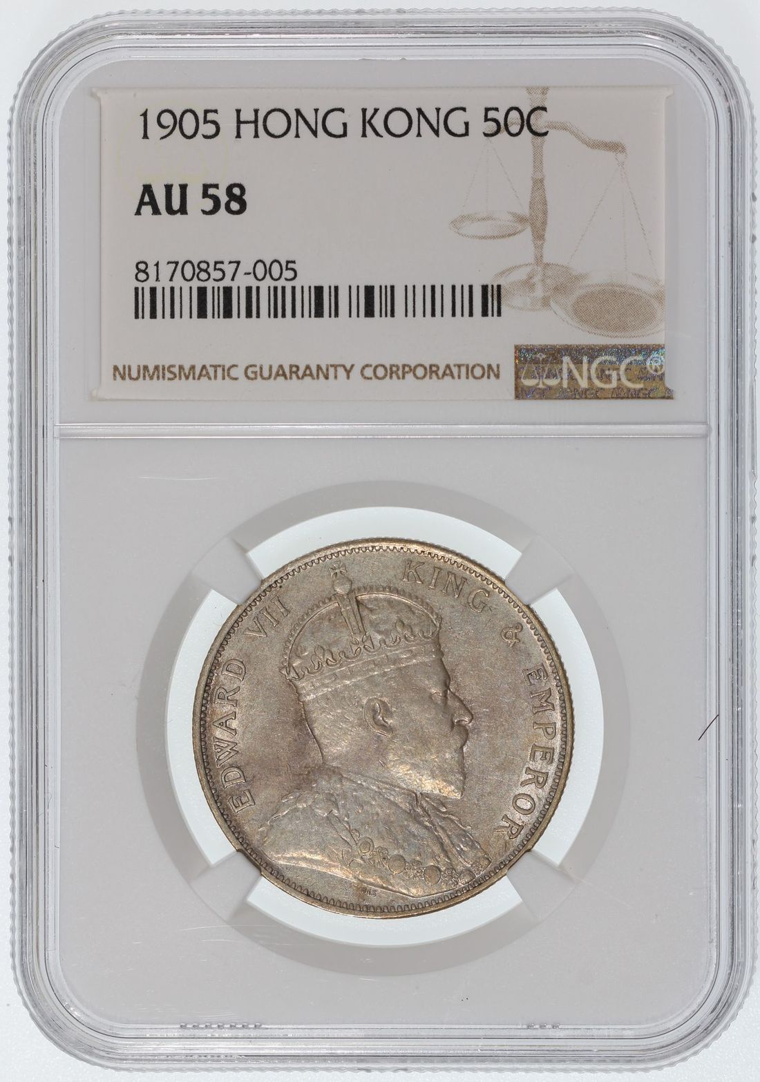 Hong Kong, Edward V, [NGC AU58] silver 50 cents, 1905, #8170857-005
