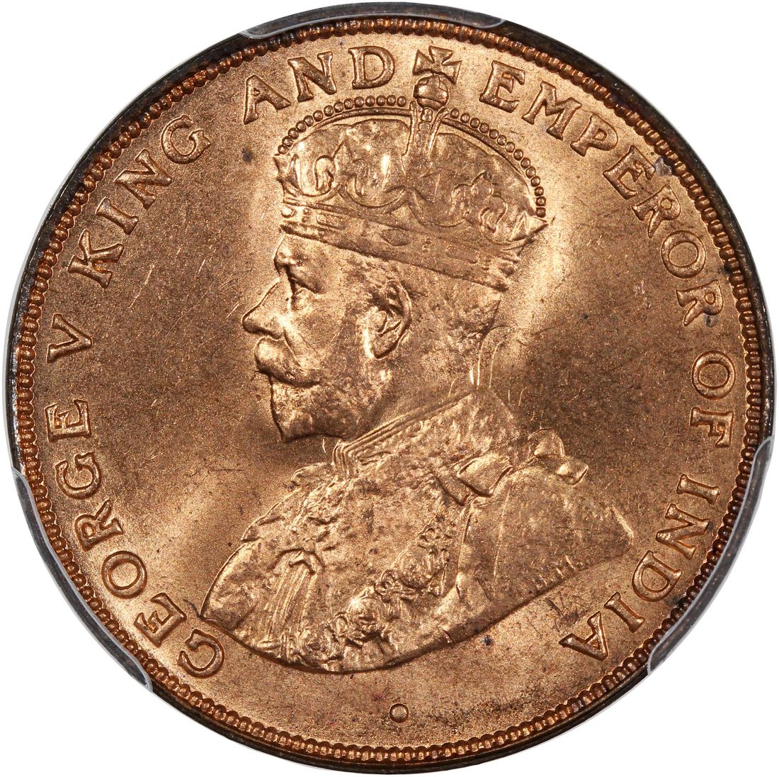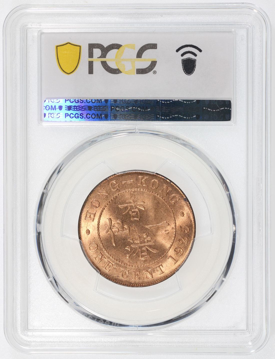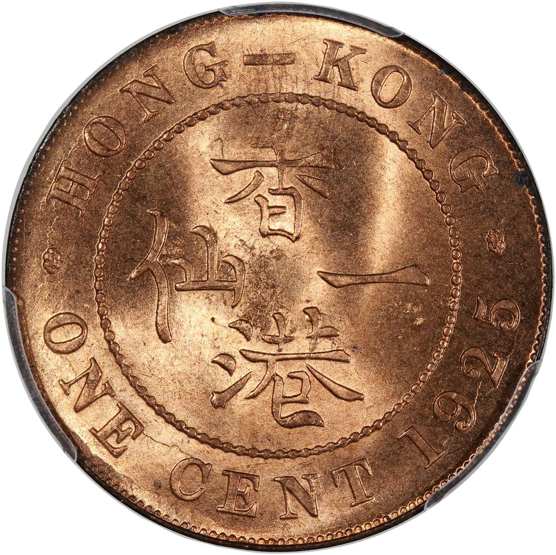 Hong Kong, [PCGS MS65+RD] bronze 1 cent, 1925, George V on obverse, (KM-16), Cert. #58667930, the second highest grade in the PCGS population report with only one better example on record